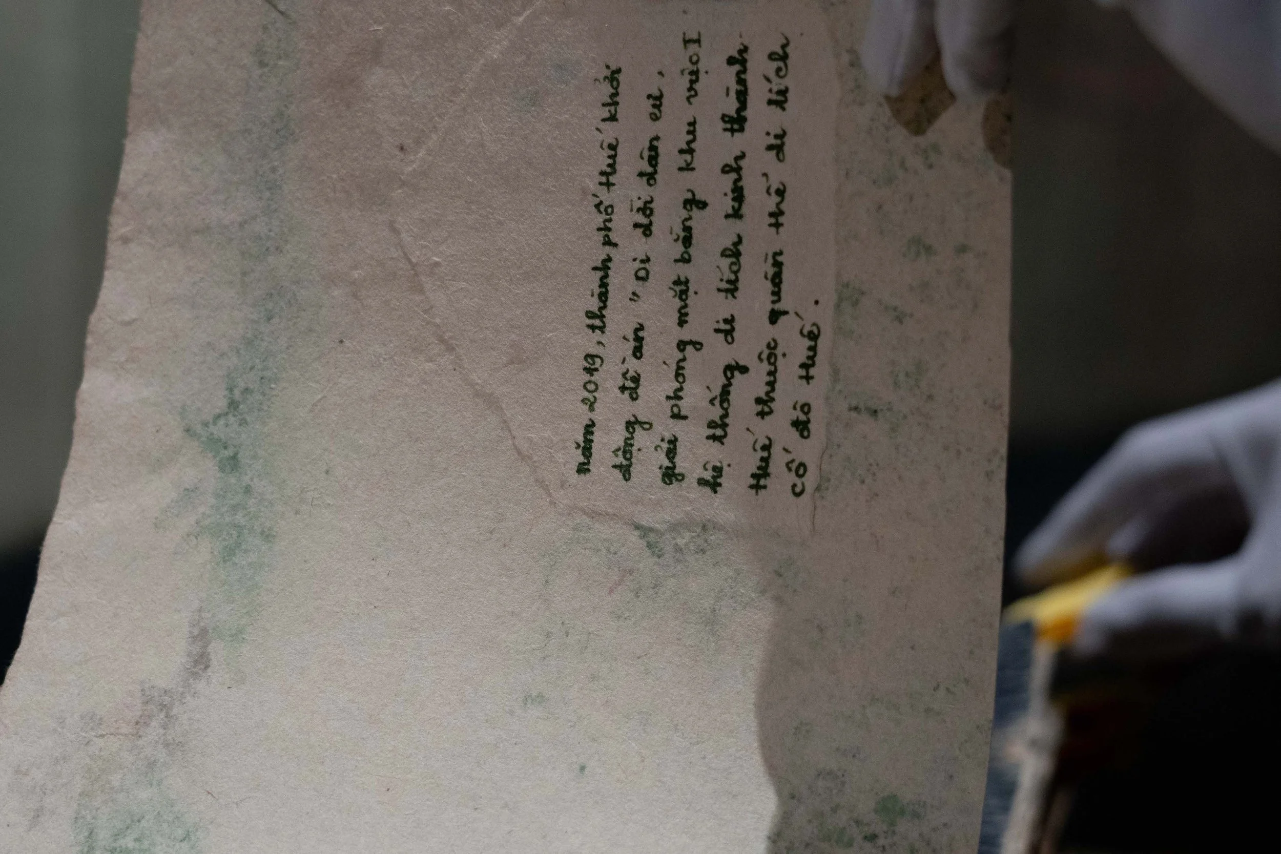 Starting with Lê Thị Minh Nguyệt and Nguyễn Thị Khánh Anh’s A Little Green Afternoon (2022), viewers are met by an influx of stories about beauties and ruins. The work takes the form of an artist’s book, narrating the mundane routines of the community members in the manner of a collective memoir. In its making, the book was passed on from one person to another, completely filled with handwriting and watercolour sketches. Flipping through the pages of the work, we catch glimpses of a poetic, yet evacuated resilience of the Citadel wall’s residents standing against the dated displacement. However, Đào Tùng’s moving image on the opposite wall would illuminate the nature of this dispute as all but a zero-sum game.