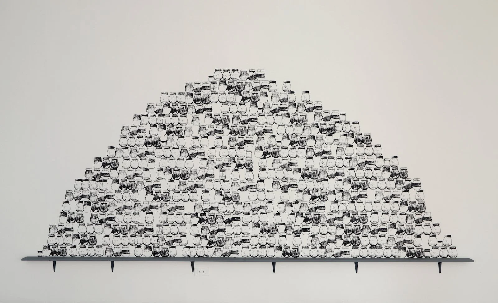 Santos transfers these prints to the wall-bound installation Mind Filled (2023). A large mound of jars stacked one on top of the other appears to rest upon a wooden shelf. Each jar is an image printed directly onto the wall. The sight is deceptive. The pile appears heavy enough to bend the beam it rests on or topple over at any moment. Yet the nature of serigraphy suggests the pile could grow endlessly. The act of printing becomes tantamount to the image itself—metaphorically bottled ideas that appear substantial in weight, yet could continue, for better or worse, in perpetuity.