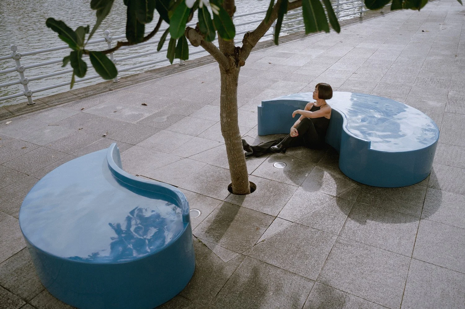 Further along the river, audiences will find A Micropolyphonic Stage (2023) by Joyce Beetuan Koh, a pair of blue benches shaped like an inverted apostrophe and a comma. Koh was inspired by her background in music and surrounding performing arts venues such as Victoria Theatre and TheatreWorks. “Putting together the various elements of lines, curves, volumes, depth, texture, tone colour, and configuration is like composing an orchestral work,” she reveals. “I think about counterpoint and harmony, hence the idea of polyphony (many voices) and micro-motives.” Intimate and serene, the bench becomes a place for mindful contemplation.