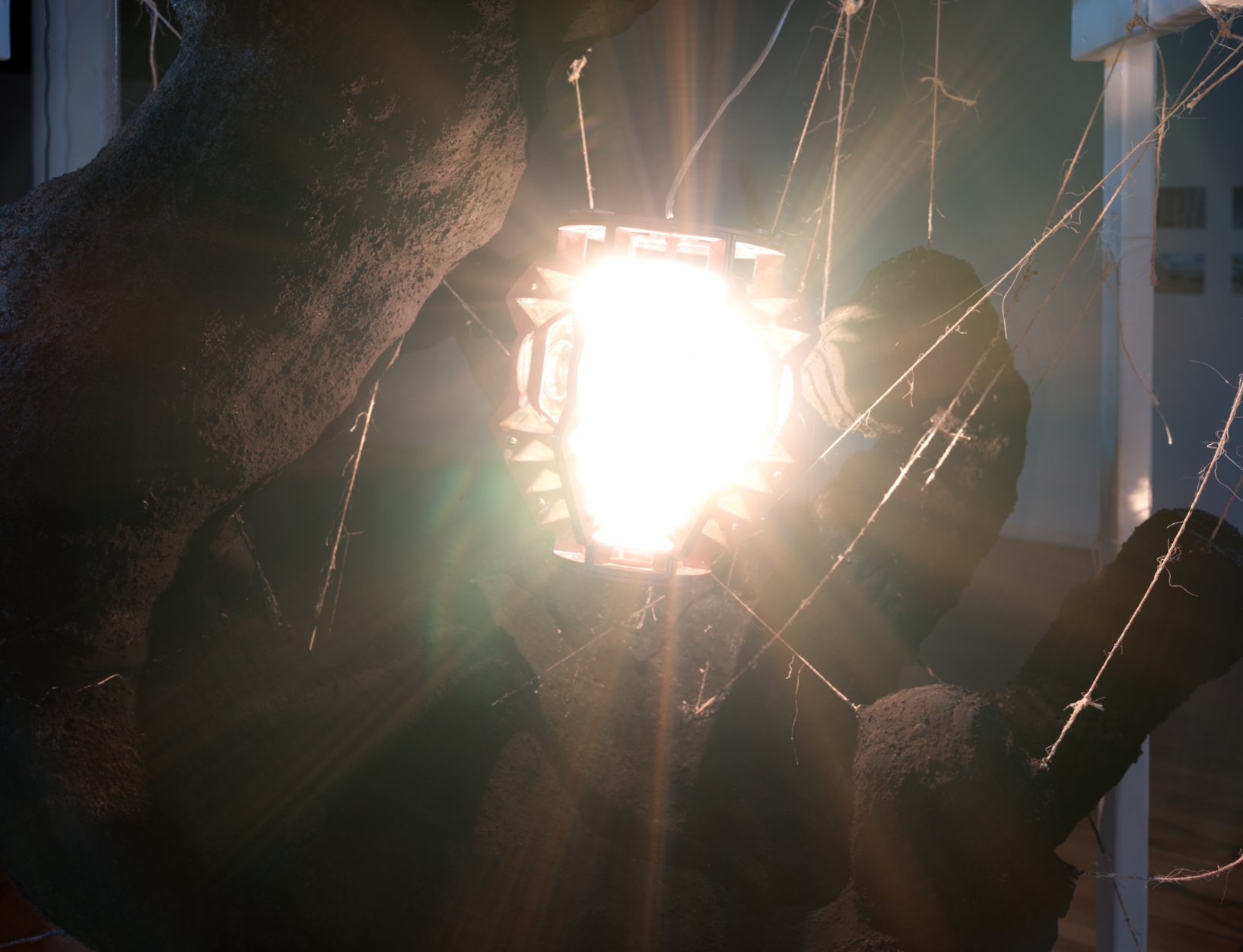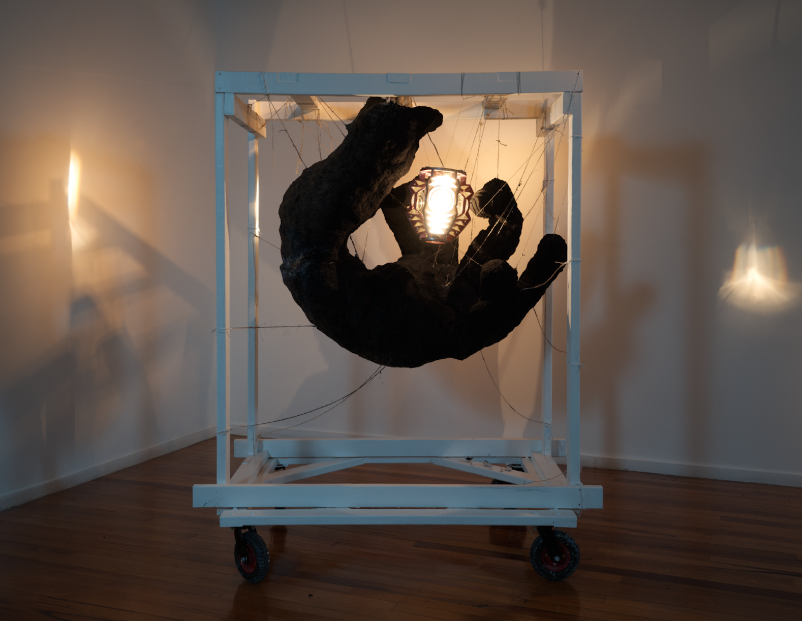 Ngô Hứa Minh Trí (ft. Daniel Legut), An Imperfect Heart Sings Like a Candle in a Storm, 2019-2023, unfired clay body, resinite, wood, wheels, twine, blue.io motherboard, Android phone, fitbit, watercolor, black paint, Fresnel lens, 81 x 162 x 198cm. Image courtesy of the artist.
