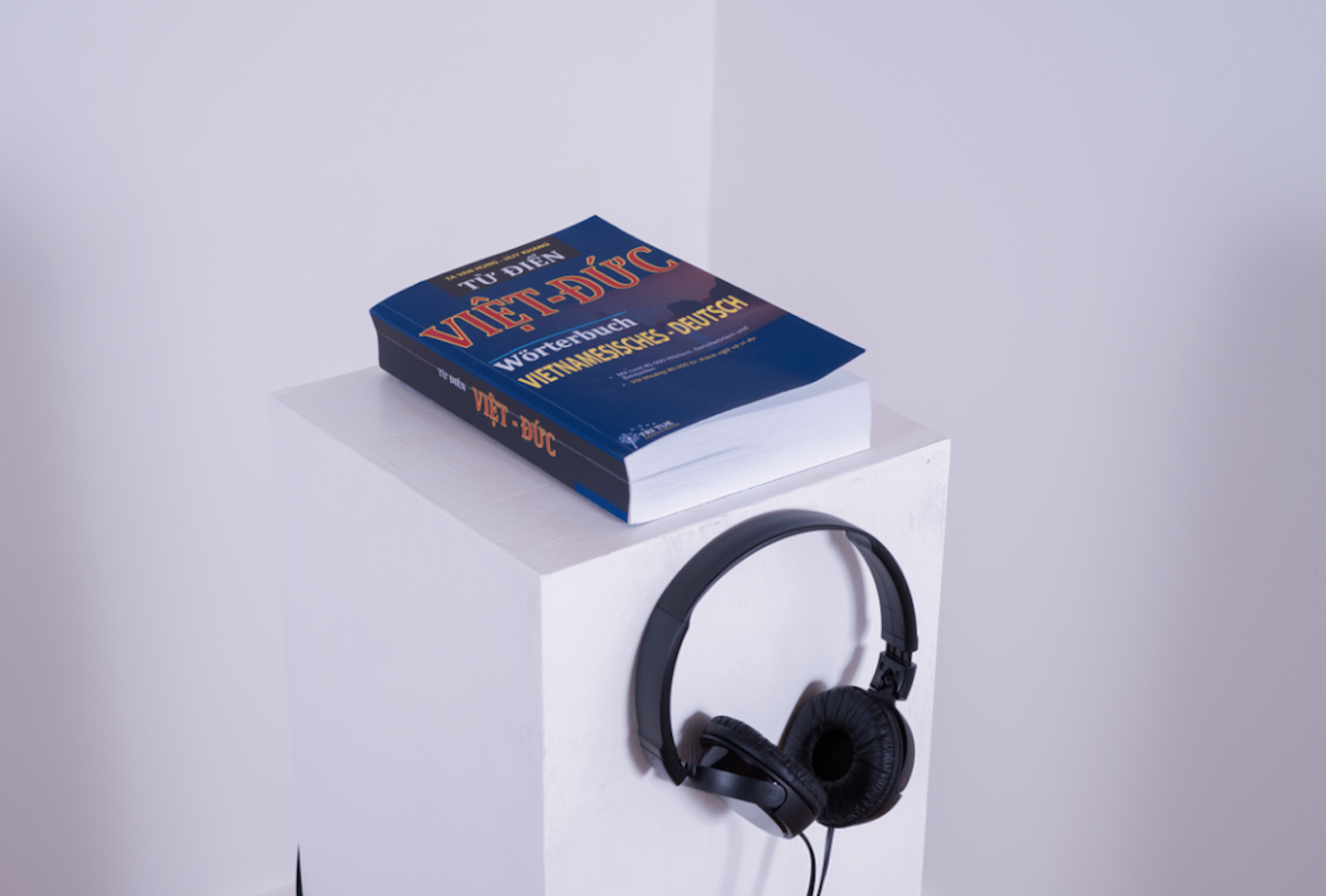 Maya Nguyen, Beginner, 2023, Vietnamese-German Dictionary, language exercises prompts, sounds of a Vietnamese-German infant. Image courtesy of the artist.