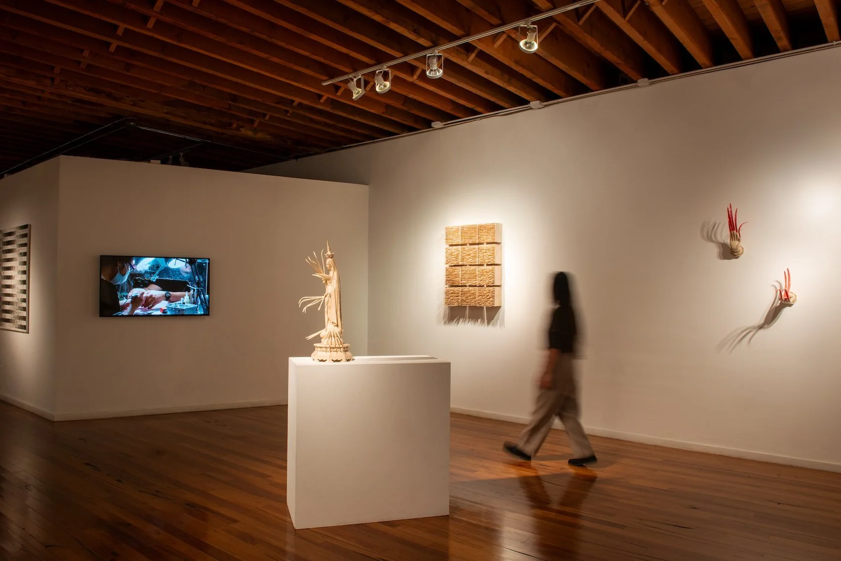 Le Hien Minh, (L-R) Nail Women, 2023. 1-channel video, color, sound. 36:00:00; Blessed Lady of the Nail, 2023, traditional Vietnamese handmade Dó paper, resin, wood, 73 x 27 x 27cm; Minority Model, 2023, traditional Vietnamese handmade Dó paper, wood, acrylic, 88 x 66 x 22cm; Invisible Dragon, 2023, traditional Vietnamese handmade Dó paper, wood, acrylic, 15 x 5cm. Photo by Laurel Hauge.