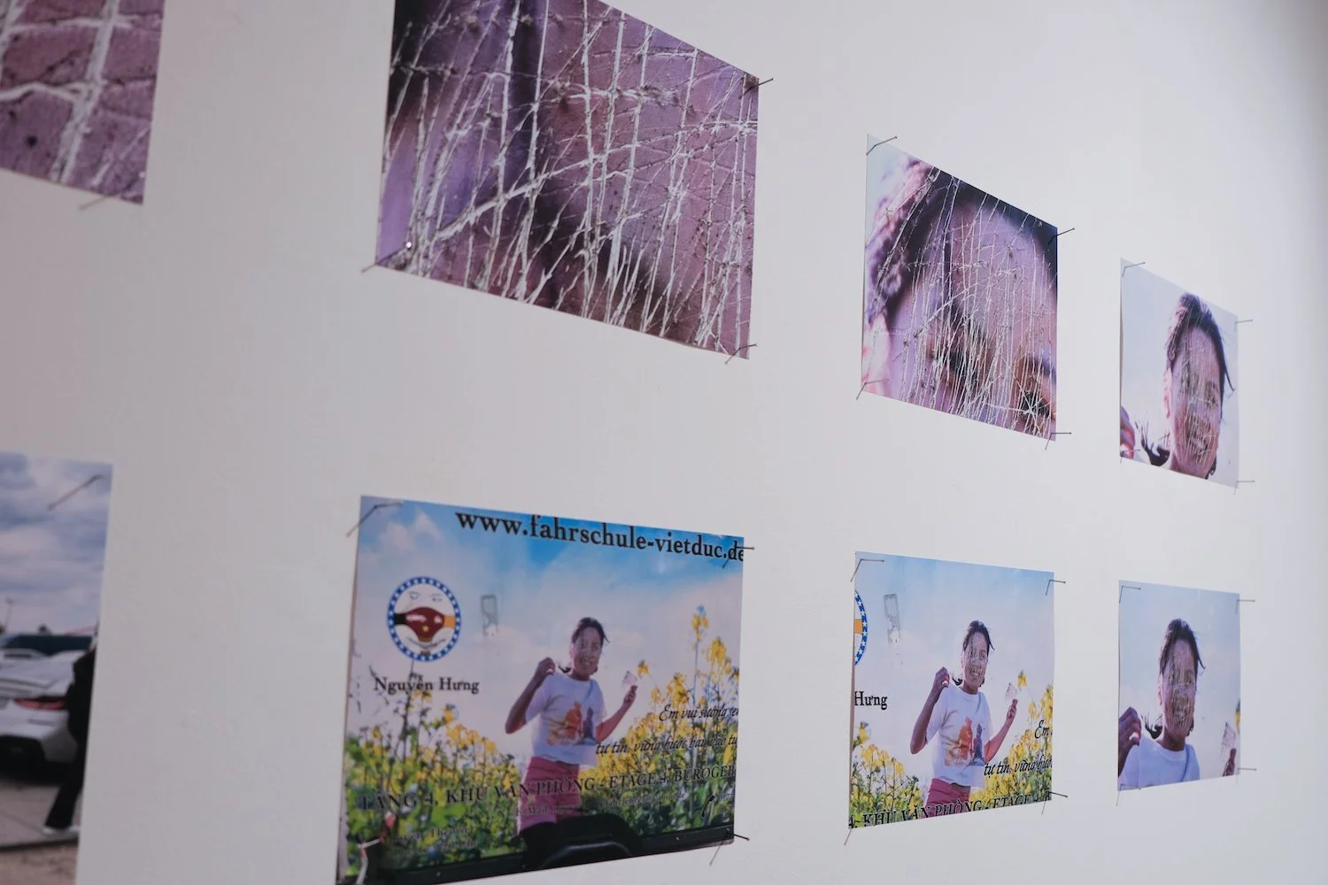 Meanwhile, Vietnamese-Russian artist Maya Nguyen veers toward conceptualism through a proposed set of print works and two sound pieces. In the former, Poster Girl (2023), a serial composition of zoomed-in photographs offers an awkward tension. Taken from a driving school in Dong Xuan Center, Berlin, the face of the model in the poster is violently scratched out. This is contrasted by her ecstatic disposition, supposedly an expression for acquiring a driving licence.