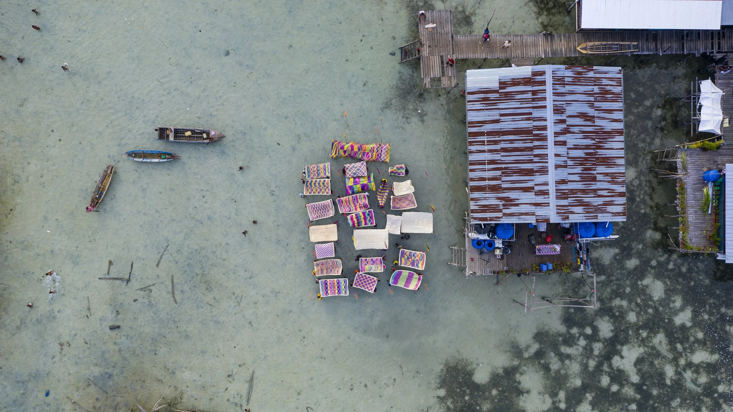 Likewise, Yee I-Lann’s two films Oh My Dalling (2022) and Budi’s Song (2023), alongside the woven mat Jalan-jalan cari Jalan (2024), highlight the centrality of weaving within the Bajau Sama Dilaut community who live on Omadal Island in Sabah, Borneo. Featuring mats (or tikar) woven from plastic pollution found in the village’s surroundings, Yee presents material evidence of the vulnerability of rural indigenous communities to the ongoing climate crisis. Left to fend for themselves, the Bajau community are nonetheless able to adapt to their changing environment, retaining essential cultural practices like weaving and singing—the latter serving as the soundtrack for both films.