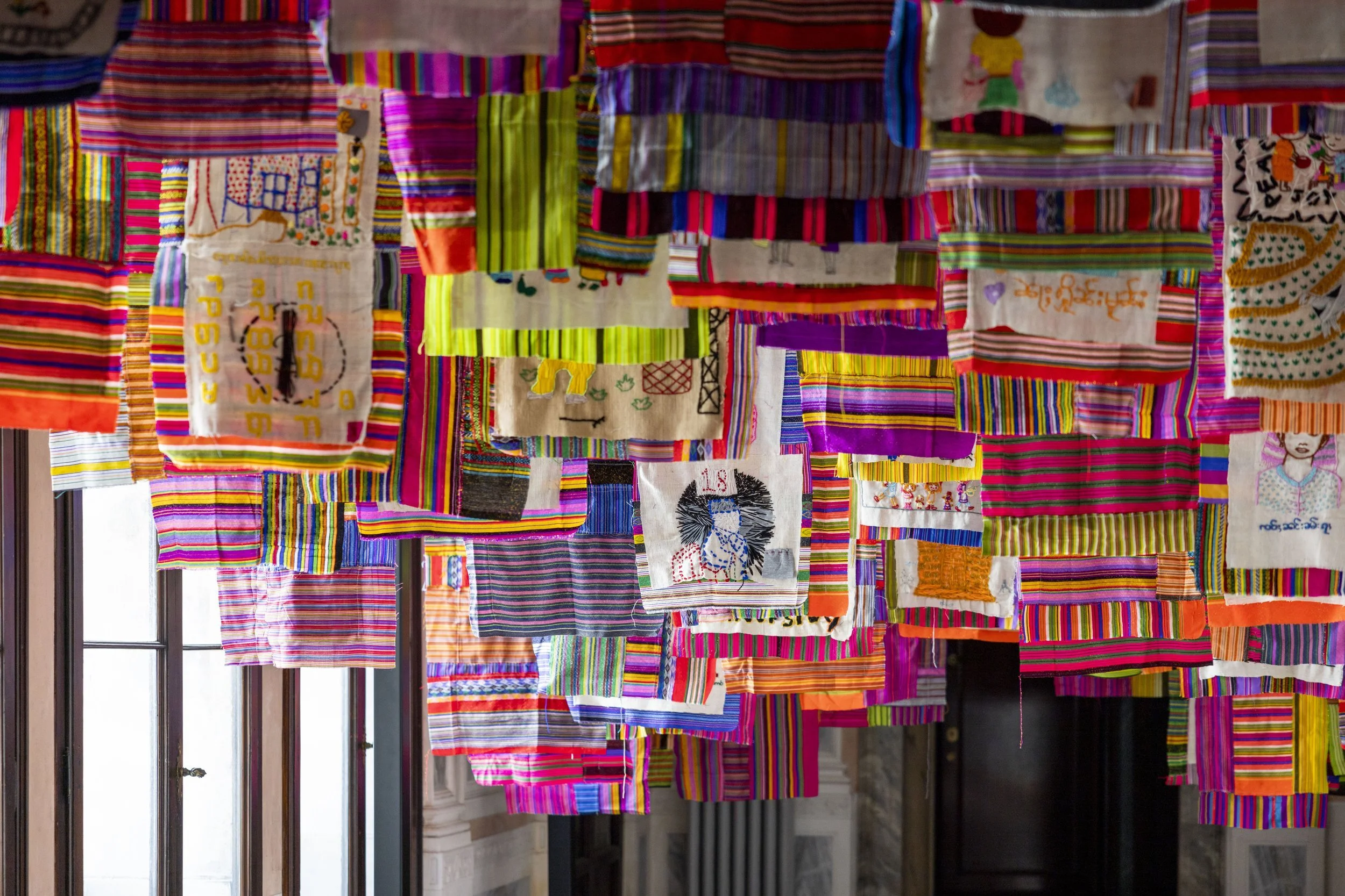 Jakkai Siributr, There's no Place, 2020, ongoing and geographically mobile collaborative 'call-and-response' embroidery installation, hand embroidery on fabric, dimensions variable. Installation view at Palazzo Smith Mangilli Valmarana, Venice, Italy. Photo by Amarin.