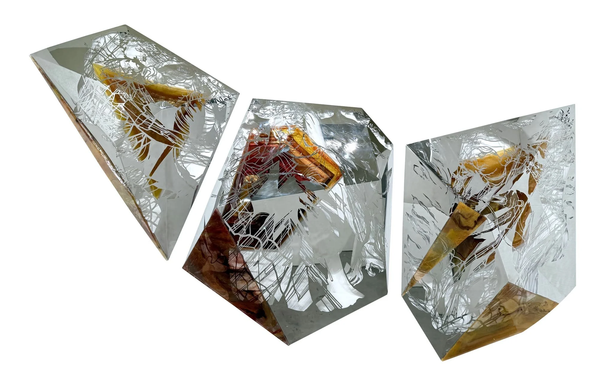 Melissa Tan, The Fates – Klotho, Lachesis & Atropos, 2024, mirror finish stainless steel, epoxy resin and pigment, 285 x 190 x 15cm. Image courtesy of the artist and Haridas Contemporary.