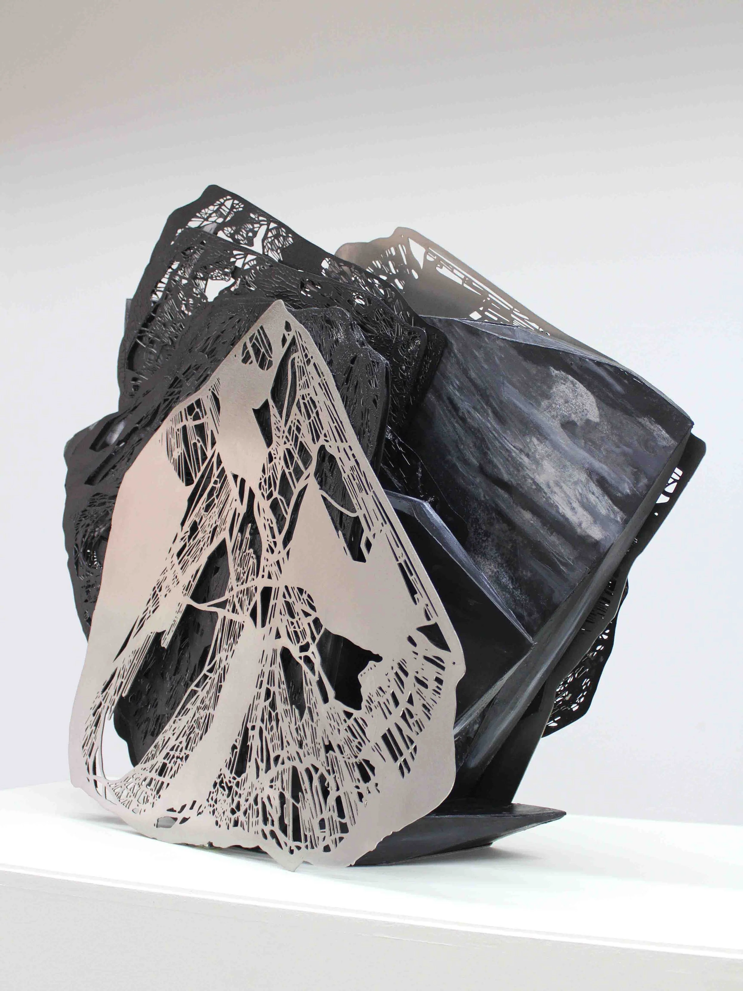 It is also this sophisticated handling of the 3D form that marks a breakthrough from Melissa’s past free-standing sculptures. Here I am referring to sculptures in the Arc of Uncertainties series, which are made of papercut and mild steel sheets bonded to a central foam core. The dense build-up of flat layers on the work’s front and back confines the viewing experience to two main sides. In contrast, these new asteroids fully engage with the sculptural form, while maintaining the same attention to intricacy and surface quality.