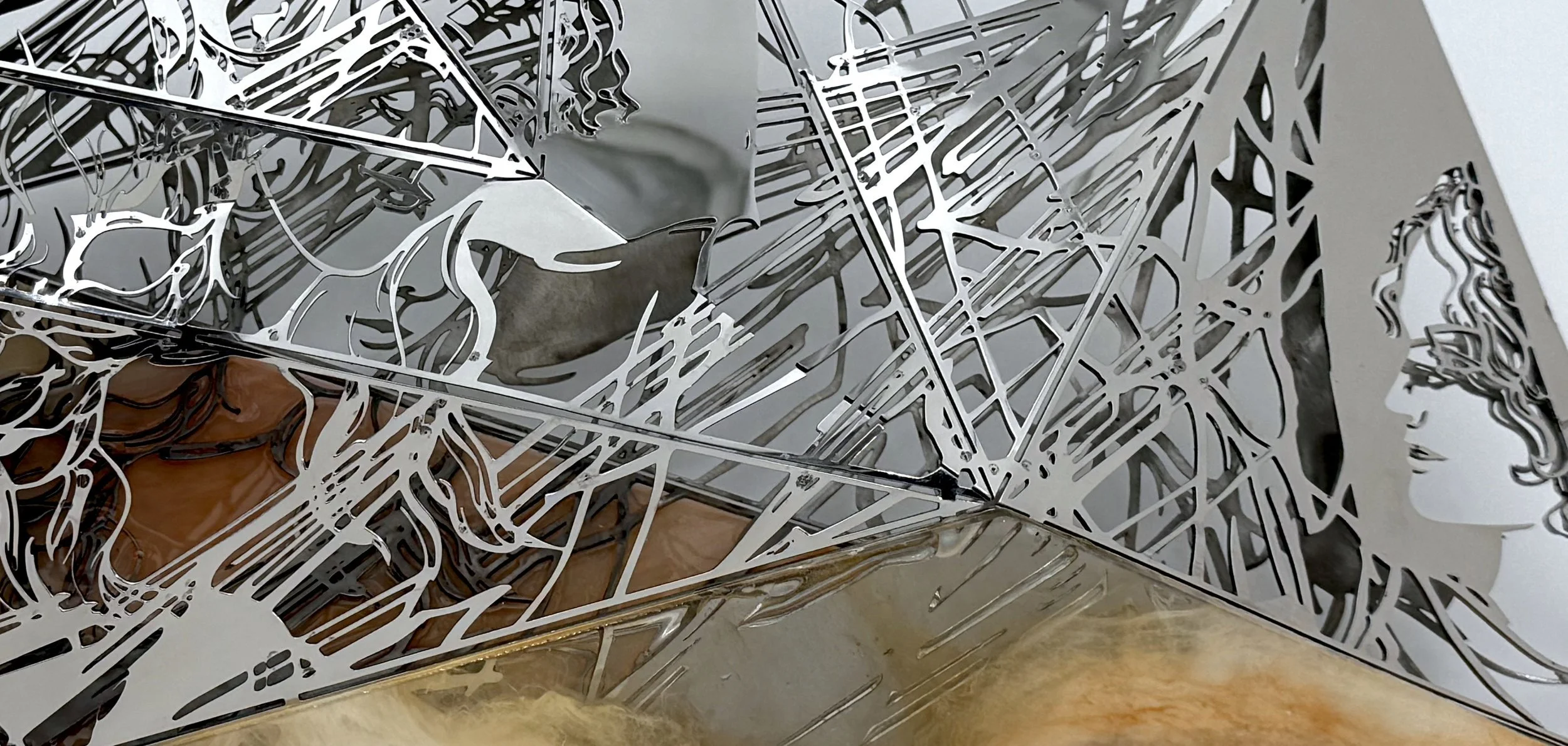 With the pedestal works, the illustration and mapped points are mirrored to create two “faces”, to close up the exposed side and allow the sculpture to stand on its own. In addition, the folds which create the three-dimensional form are varied on the top and bottom “faces”. This results in more nuanced shape, highlighting different segments of the illustration depending on the direction one views the work from. Audiences can also look through the laser cut sections into the hollow core where they may see elements hidden by the resin shards. The possibility of finding different perspectives of the same character and image within one work plays to Melissa’s premise of reseeing these mythological stories in a new light.