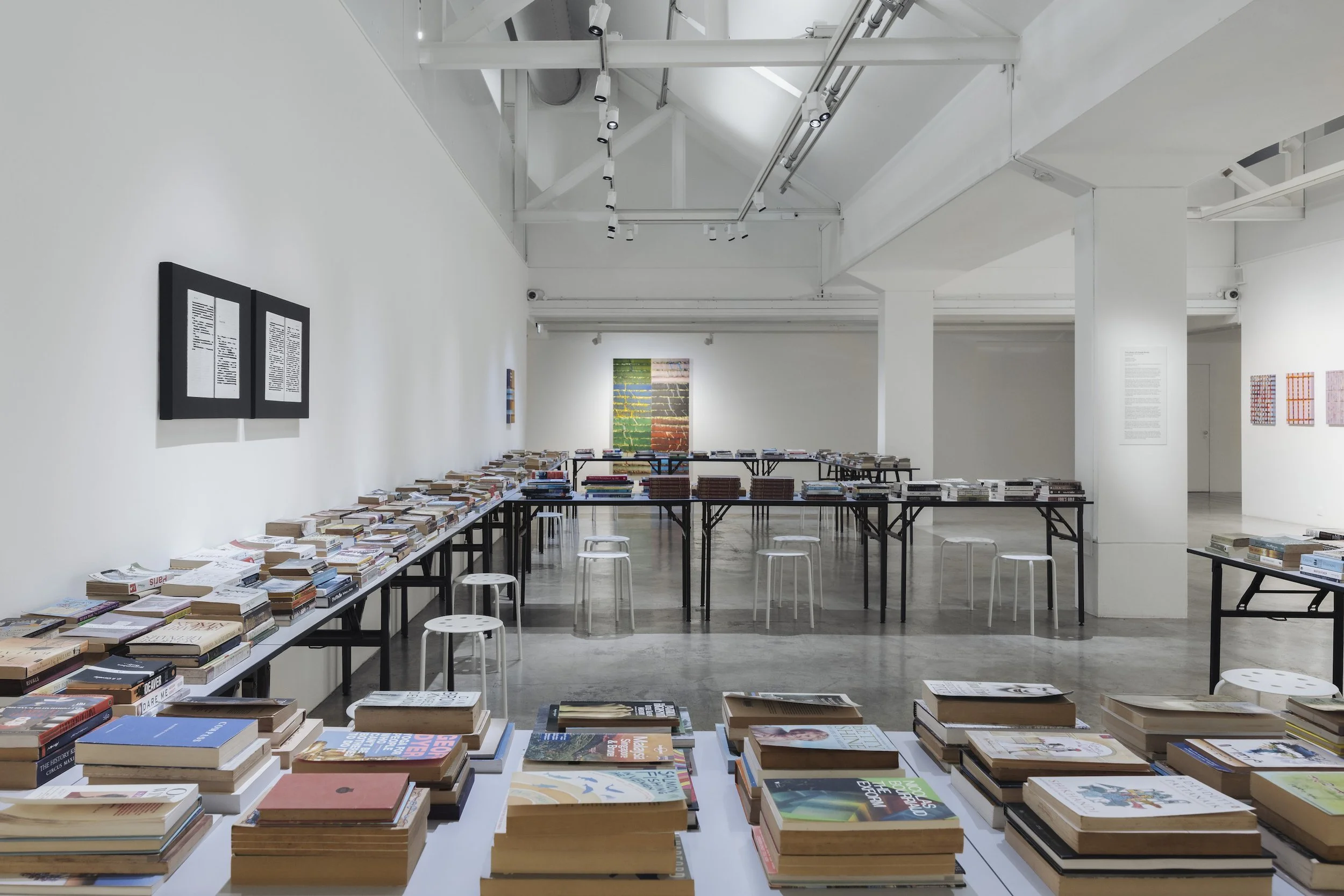 Heman Chong, The Library of Unread Books, 2016 - ongoing, exhibition view in Meditations on Shadow Libraries. Image courtesy of STPI – Creative Workshop & Gallery, Singapore.
