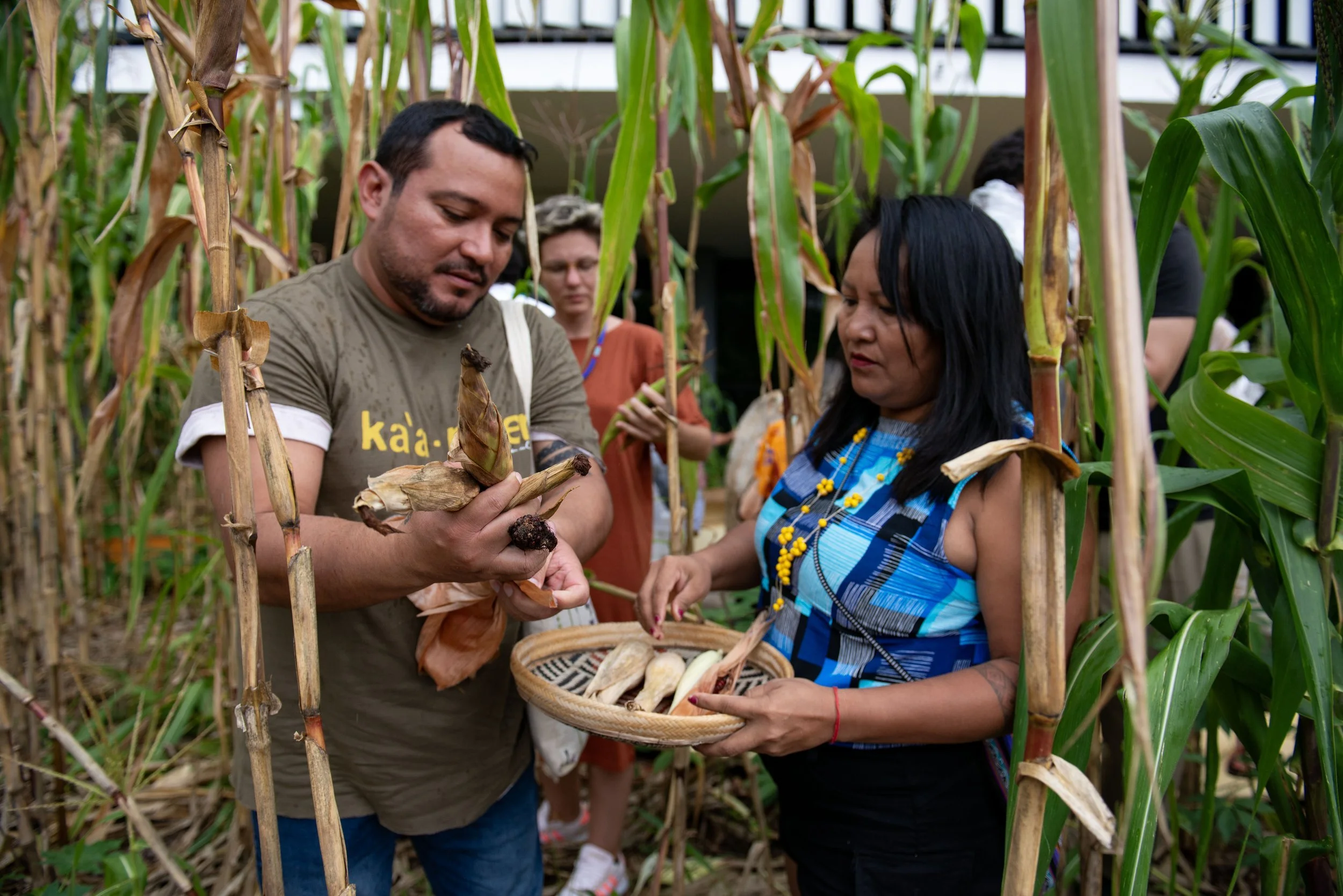 Artist Denilson Baniwa during the harvest of Kwema/Amanhecer/Dawn on 2 February 2024. Site-specific installation commissioned by the 35th Bienal de São Paulo. Photo by Levi Fanan. Image courtesy of Fundação Bienal de São Paulo.