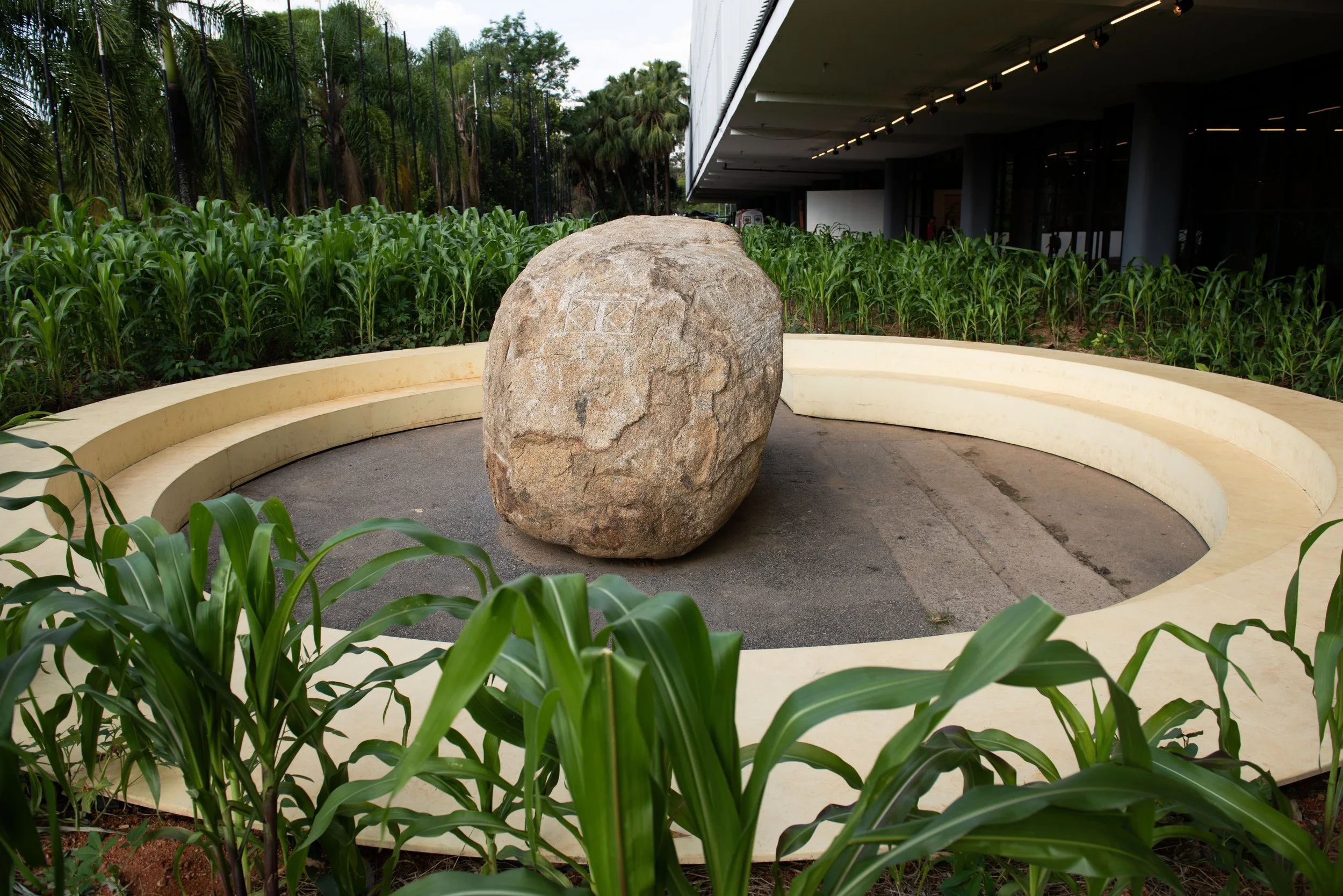 This edition of the Bienal, titled Choreographies of the Impossible, brought together several indigenous artists from Brazil and the rest of the world. It upheld some Indigenous core values, such as reference to non-linear temporality, moving away from the linear concepts prevalent in modern Eurocentric societies. This idea is central to the practice of Brazilian visual artist and Indigenous activist Denilson Baniwa. Kwema/Amanhecer/Dawn (2023), featuring a garden with 25 plant species native to the Americas, such as corn, chilli, potato and yucca, highlighting the importance of seasons, moon phases, and cycles in guiding rituals and life. Wooden raised beds built over the concrete floor led to a circular area centred by a large carved stone, mimicking a meeting place usually found in Indigenous communities. A collective harvest and round table happened in February 2024, closing the natural cycle of the crops and extending the life of the artwork further from the end of the Bienal in December 2023.
