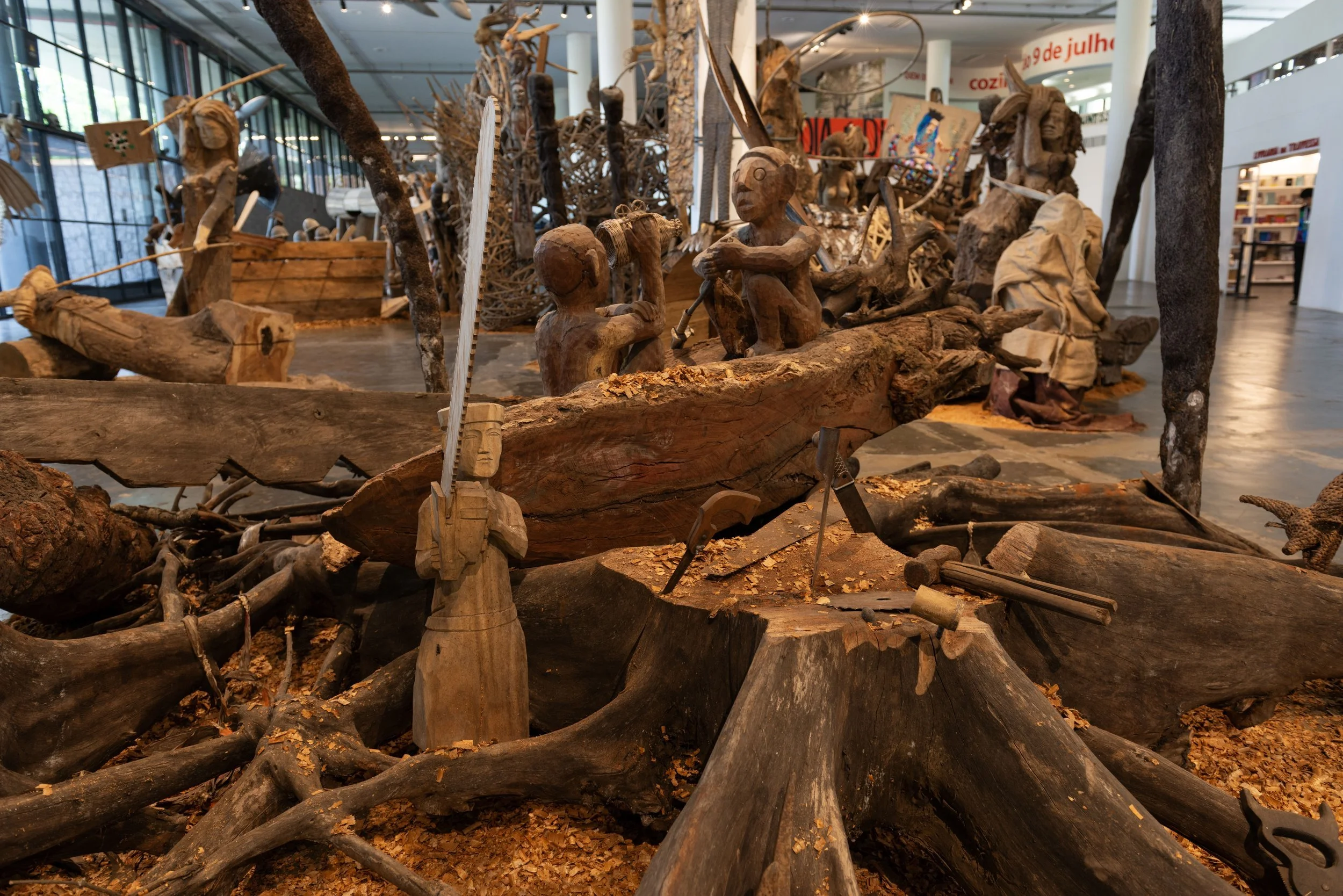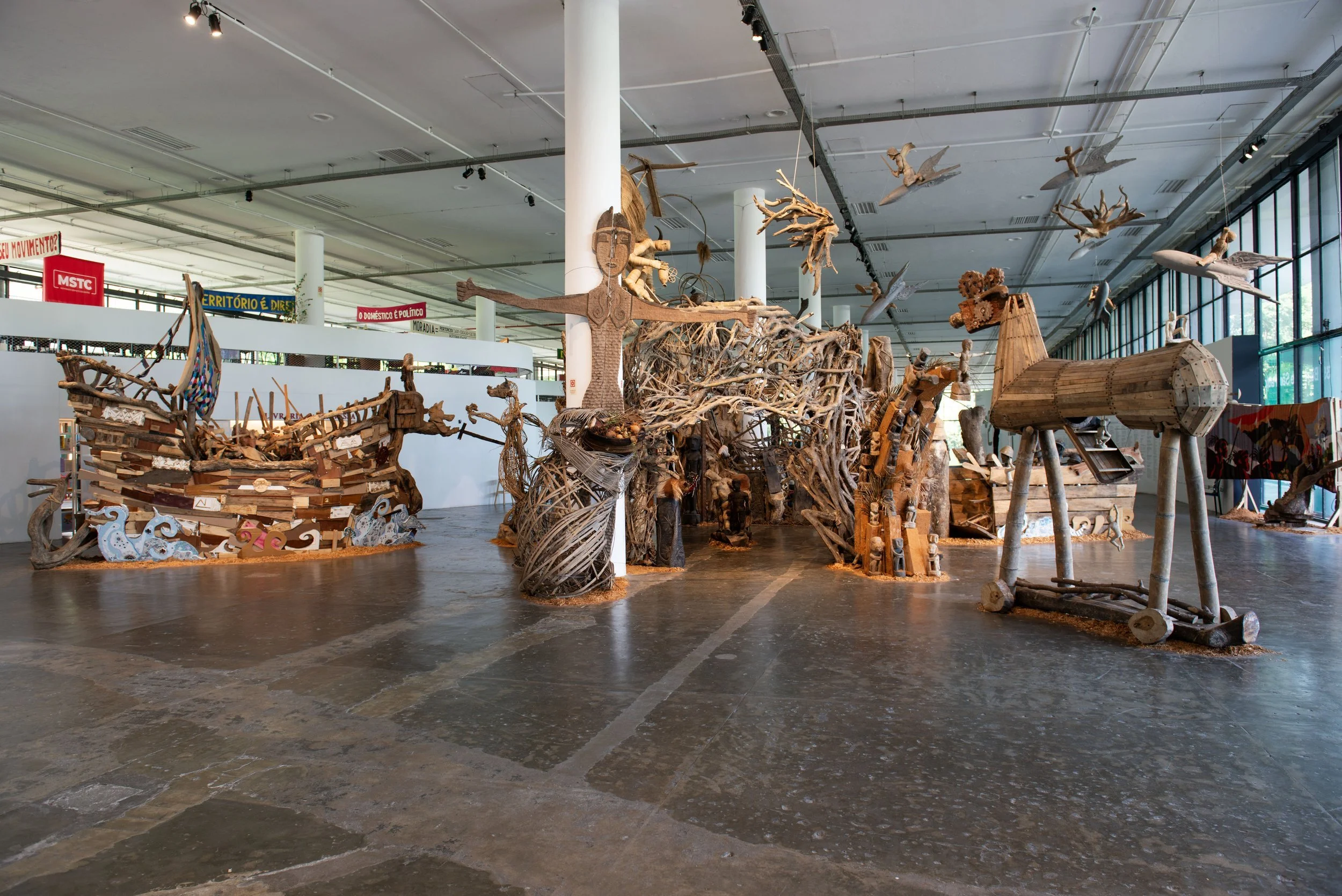 Kidlat Tahimik, Killing Us Softly... With Their Spams... (Songs, Prayers, Alphabets, Movies, Superheroes...), 2023, wooden trunks, roots, sawdust, bamboo, vegetal fibres, jute, fabric, resin, metal and plants, variable dimensions. Site-specific installation commissioned by the 35th Bienal de São Paulo. Photo by Levi Fanan. Image courtesy of Fundação Bienal de São Paulo.
