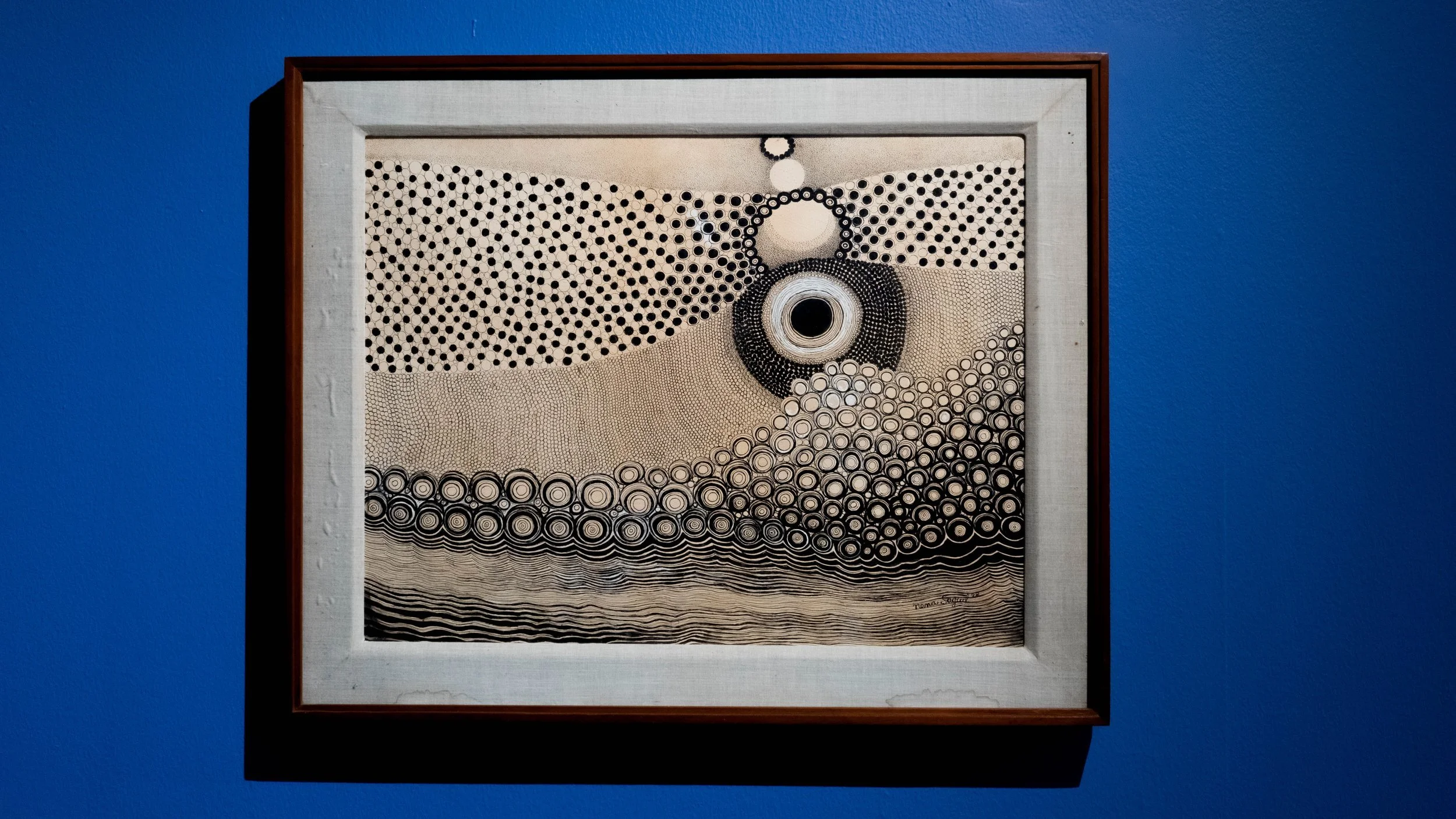 At the other end of the gallery, the works of Saguil wander about dim winding pathways. Flores directs visitors to the loose and mysterious rhythm of Saguil, the distant niece of the painter Juan Luna (1857–1899) and the first woman to earn an award in the prestigious Art Association of the Philippines competition in 1949. At this juncture, the small maze hosting pen-and-ink works on paper echoes the complex network of rotund and turning strokes that typify Saguil’s milky and gaseous corpuses. Of these, striking examples include Paris (1958), Untitled (1963), and The Abyss (1963). The works were rendered ruminative by the show’s dark blue enclosures and made even more so by rare photographs of the artist in Paris.