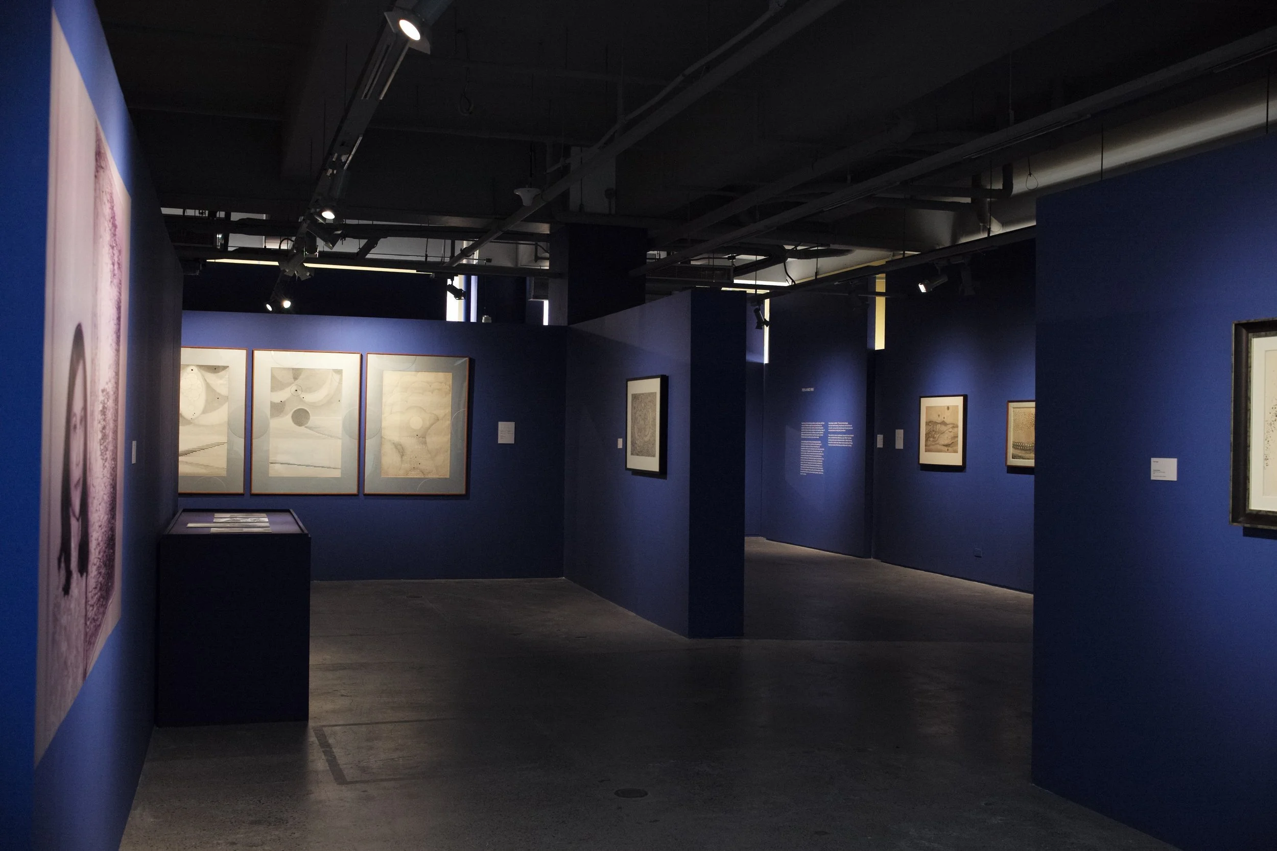Ink works on paper and photographs of Nena Saguil in the blue section of Material Inspirations. Image courtesy of the Metropolitan Museum of Manila.