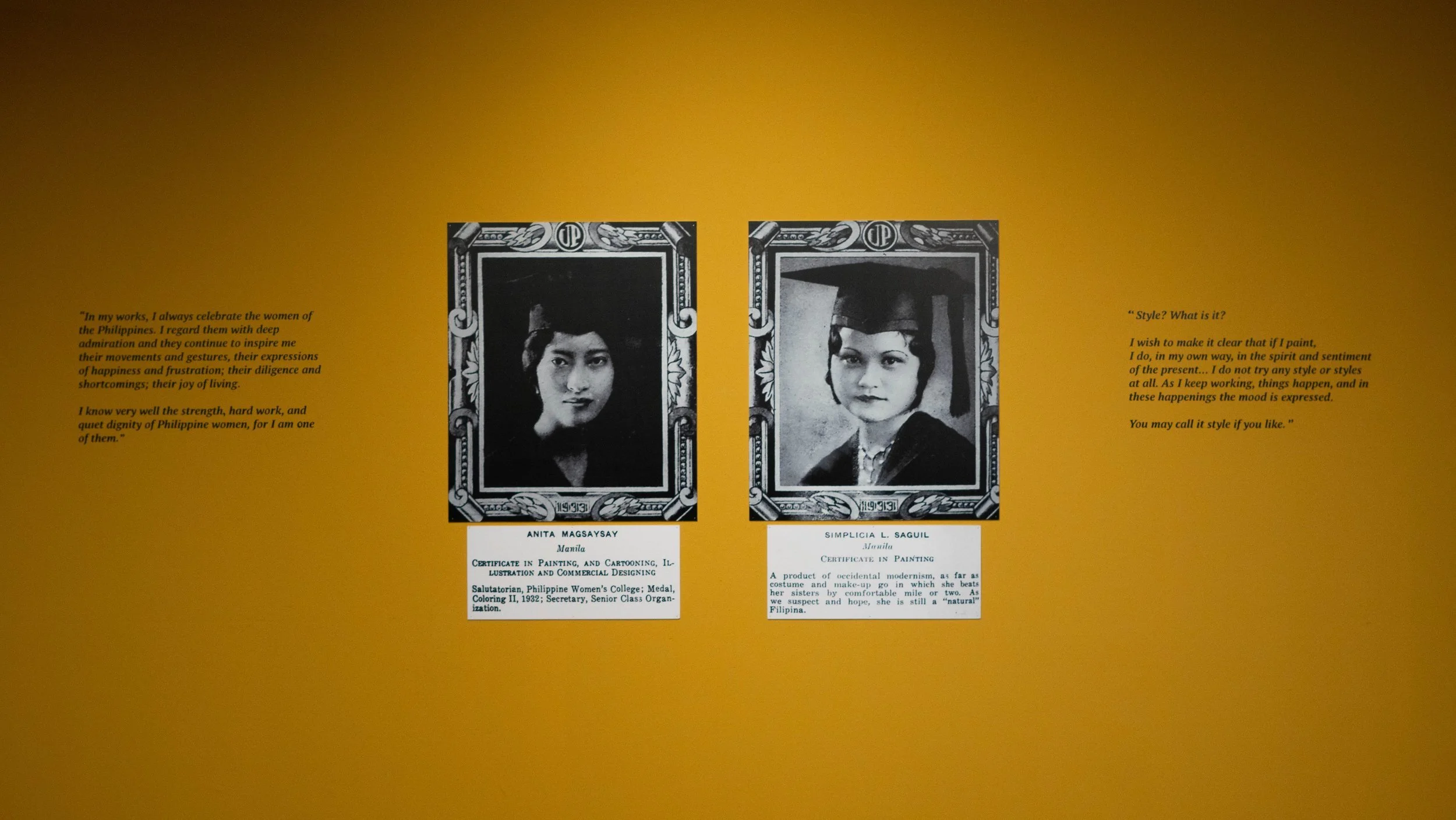 Anita Magsaysay-Ho and Nena Saguil’s 1933 graduation portraits flanked by anecdotes by the artists. Image courtesy of the Metropolitan Museum of Manila.