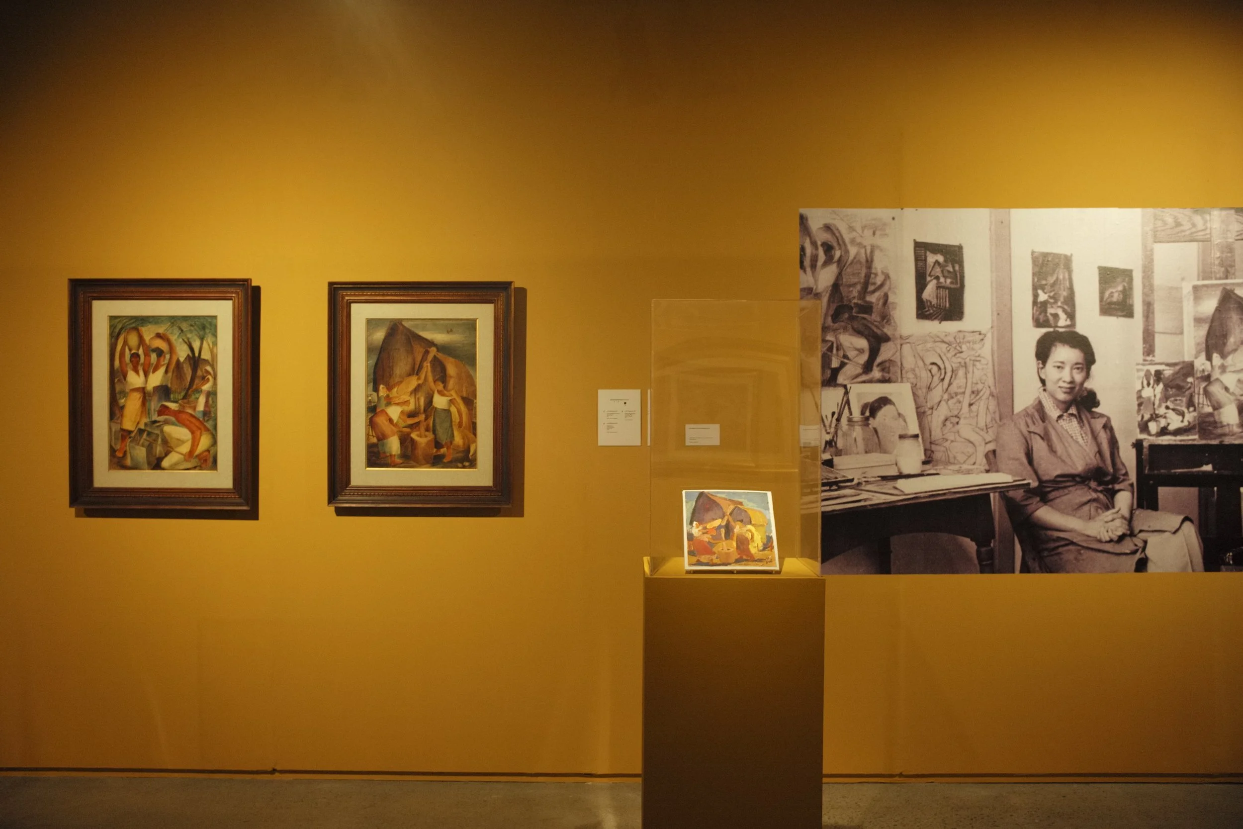 Paintings, studies, and photos of Anita Magsaysay-Ho in the yellow room of Material Inspirations. Image courtesy of the Metropolitan Museum of Manila.