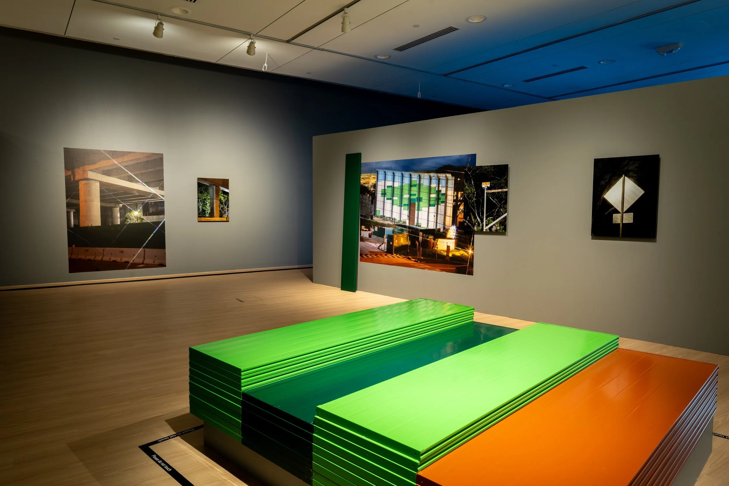 The installation features a pile of green and brown scaffolding panels—usually arranged to form a tree—placed parallel to form a conspicuous square in the centre of the installation; elevated to the level of found object art and visually resembling colour field painting, viewers are asked to consider them as objects of visual culture. In the process, they shed their original role as barricades and now ironically need to be protected by the construct of gallery etiquette, as asserted through the imperative of “Please do not touch” repeated across the black demarcation line on the ground.
