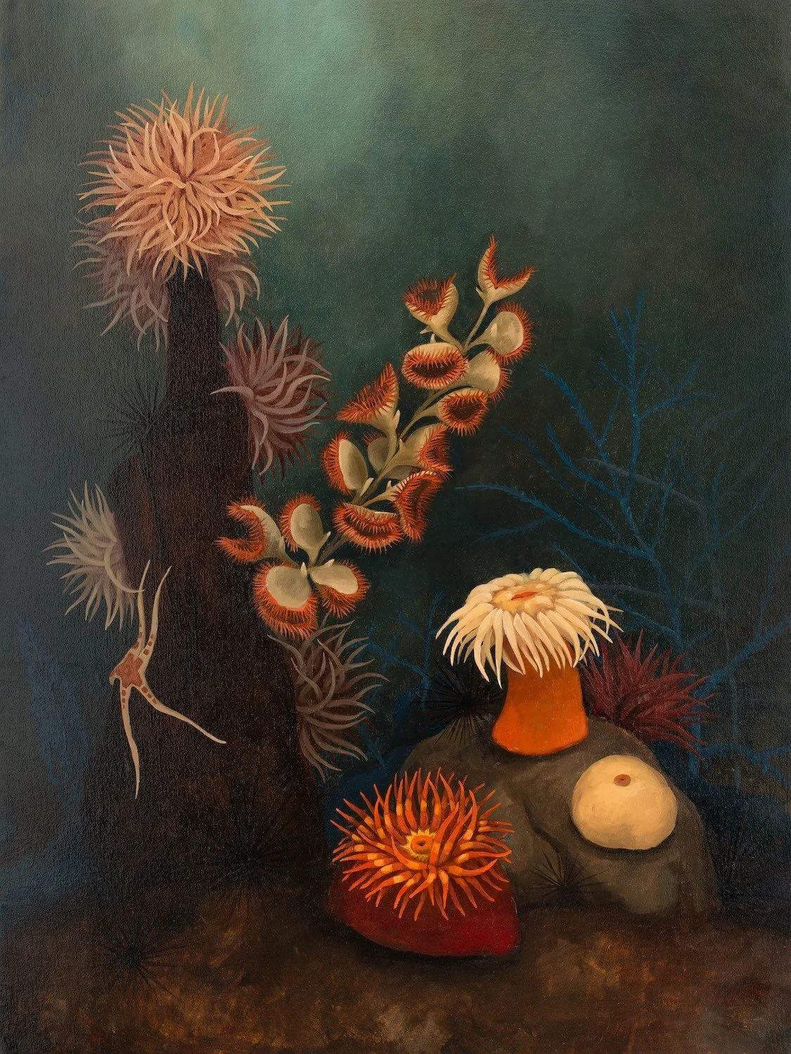 In an earlier show, Writhing, the artist explores the underwater world and similarly conjures up lush paintings of sea urchins and starfishes, anemones and murky seabeds. Again, the artist inspires with her colourful portrayals of non-human creatures in a bid to negotiate and achieve a natureculture perspective, where human culture and nature are, in fact, inseparable. In addition, Writhing alludes to the body and the tensions that come along with it. By insinuating the association through vaguely corresponding yet non-anthropomorphic forms, the artist confers upon the viewers a feeling of alienation to highlight our disconnection from the commodified nude figure. This discomfort towards the female body is further accentuated by the writhing forms, rendering a grotesque sensation upon the otherwise beautiful and brightly-coloured creatures.