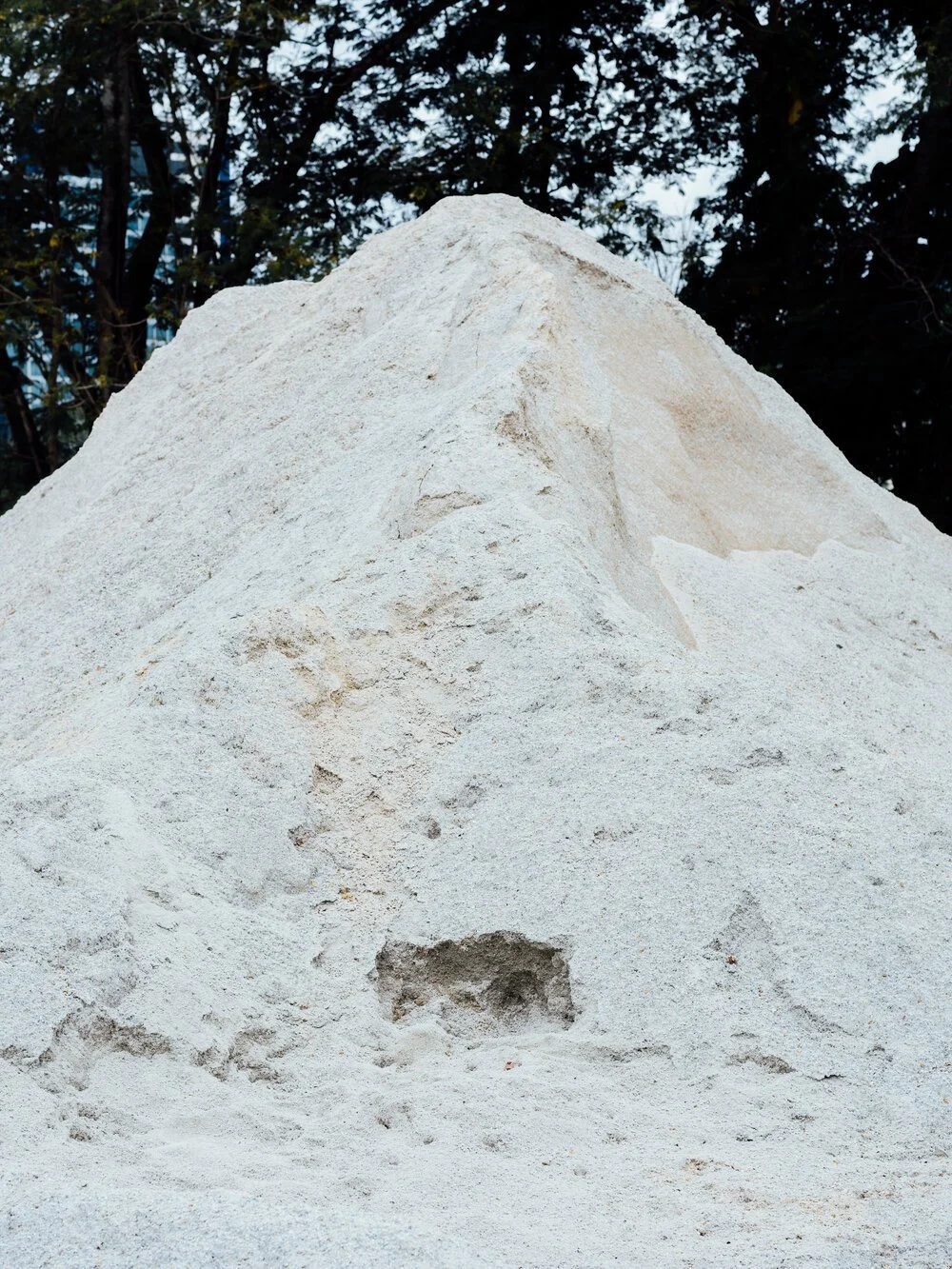 Each image in Alvin’s Borderline series, completed in 2020, takes a structure and makes it into a monument, blurring the language of industrial landscapes and platonic forms. A pile of bricks becomes a ziggurat, a fence cuts across the page in perfect two-point perspective, a twig-like tree trunk pleads to be read as a straight line. Vitruvius’s rules for architecture, ‘firmitas’, ‘utilitas’ and ‘venustas’, i.e., commodity, firmness, and delight, come to mind. Alvin’s subjects sit heavy and assuredly in the space of the photograph but are likely to disappear in the space of days or months, once the bricks are used, the sand has filled uneven ground, and another edifice is completed. These images are testaments to instances of the liminal state between built and unbuilt; instances that can only be captured in the instant click of a photographer’s lens.
