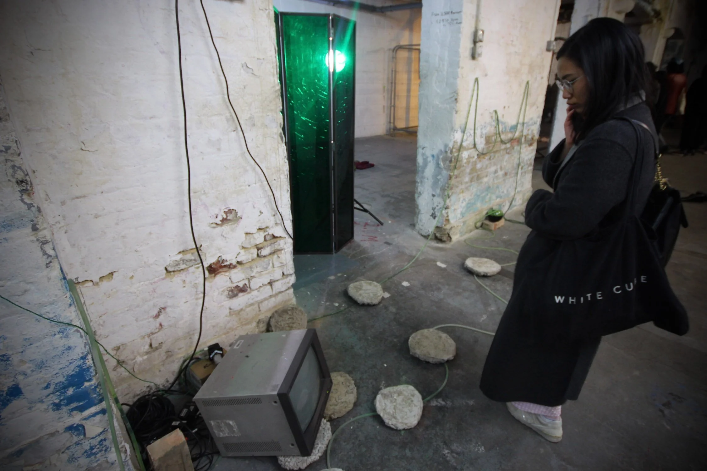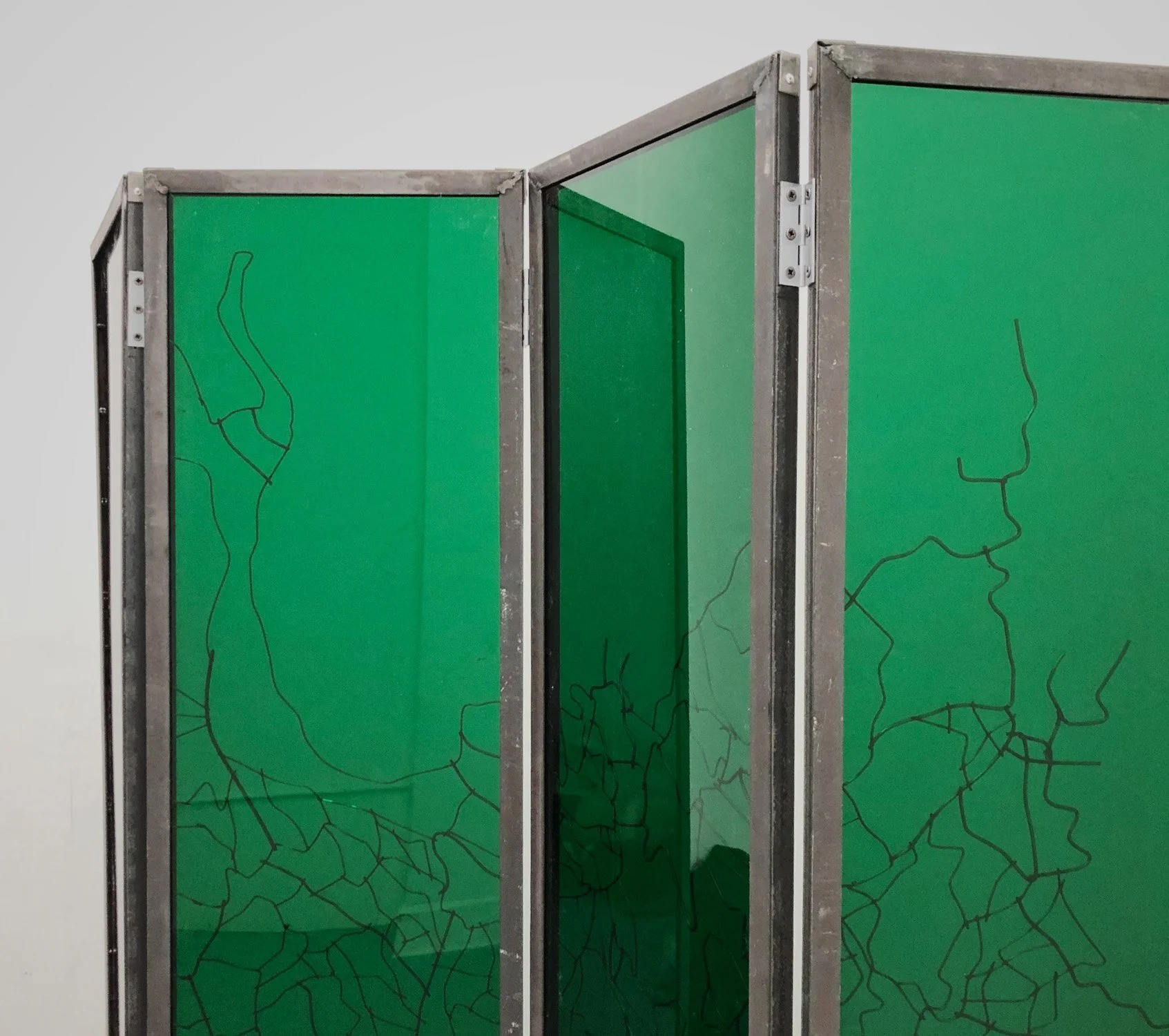 Duong’s Unnamed Land (2022), exhibited at De-Oriented, explores new visual language to engage with climate emergency and effects of urbanisation in Vietnam. Web-like engravings in the shape of the map of Hanoi crawl across the green tinted glass folding screen, mirroring the water tube that guides our eyes through concrete blocks, brick walls and onto an analogue television set. Revisiting her memory of Hanoi, Unnamed Land negotiates geography and identity, revealing the political and social reality of life in Vietnam under the effect of the climate crisis. The water tube is equipped with a motion sensor such that green liquid moves within the tube and through concrete blocks as viewers pass by. The stimulated movement of the liquid draws connection with circulation within the human body. The life and preservation of a city is layered with the sense of immediacy that expresses direct consequences of the climate catastrophe on the energy and health of the people of the land.