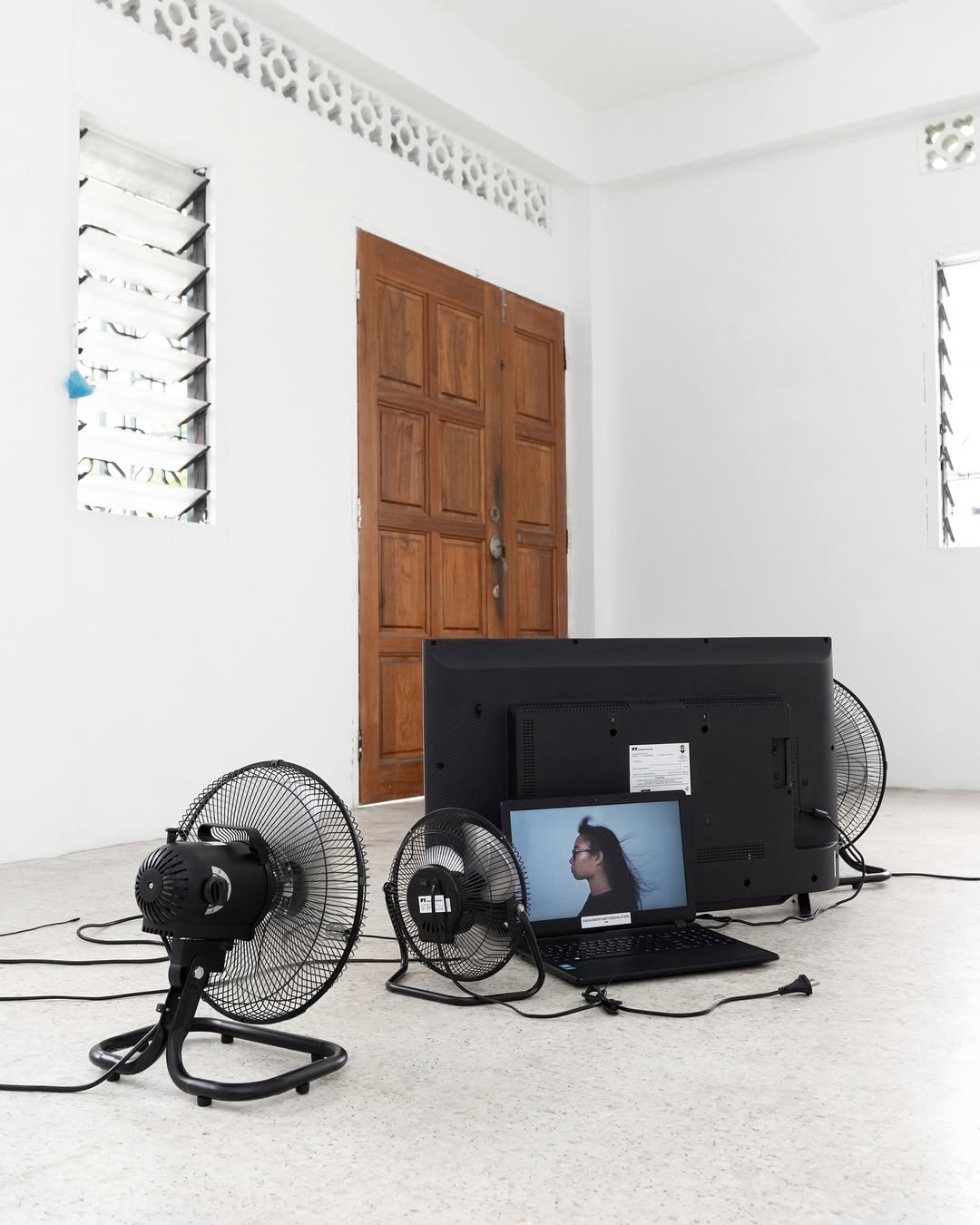 TY, Exit (A), 2025, fans, TV, laptop, video (looped), extension cords, phone charger/cable, automatic air freshener, house key, duster and air, dimensions variable. Image courtesy of the artist. Installation view at 293 artist-run space, Kuala Lumpur. Image courtesy of the artist.