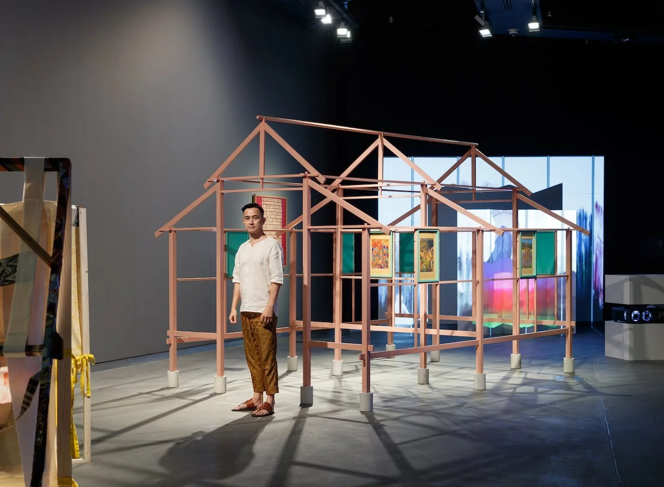 Leon Leong with his work, Stilt House No. 1, 2022, at ILHAM Gallery, Kaula Lumpur, Malaysia. Image courtesy of the artist.