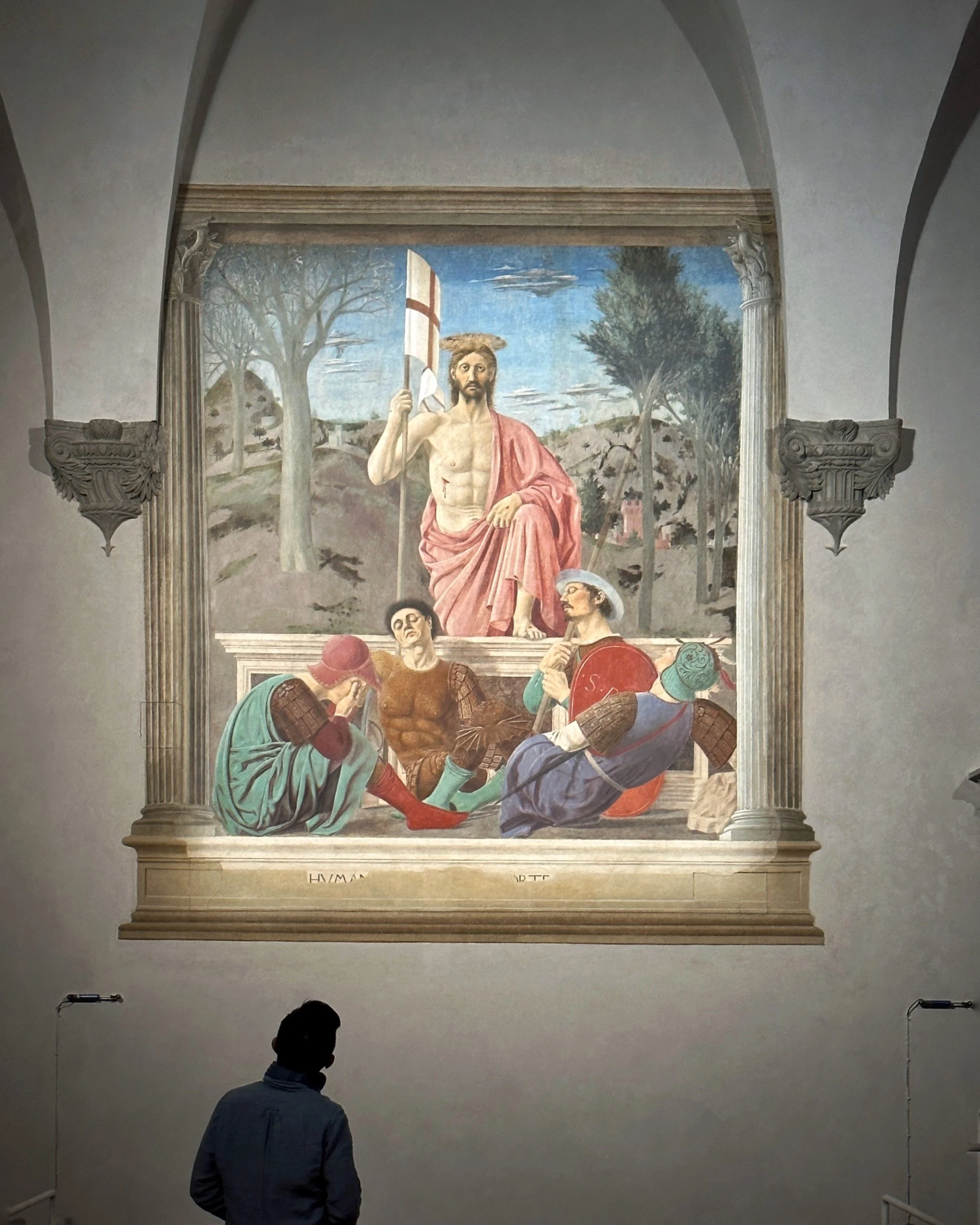 Leon Leong viewing The Resurrection by Piero della Francesca during his travels from Milan to Umbria as part of the Piero pilgrimage in Italy. Image courtesy of the artist.