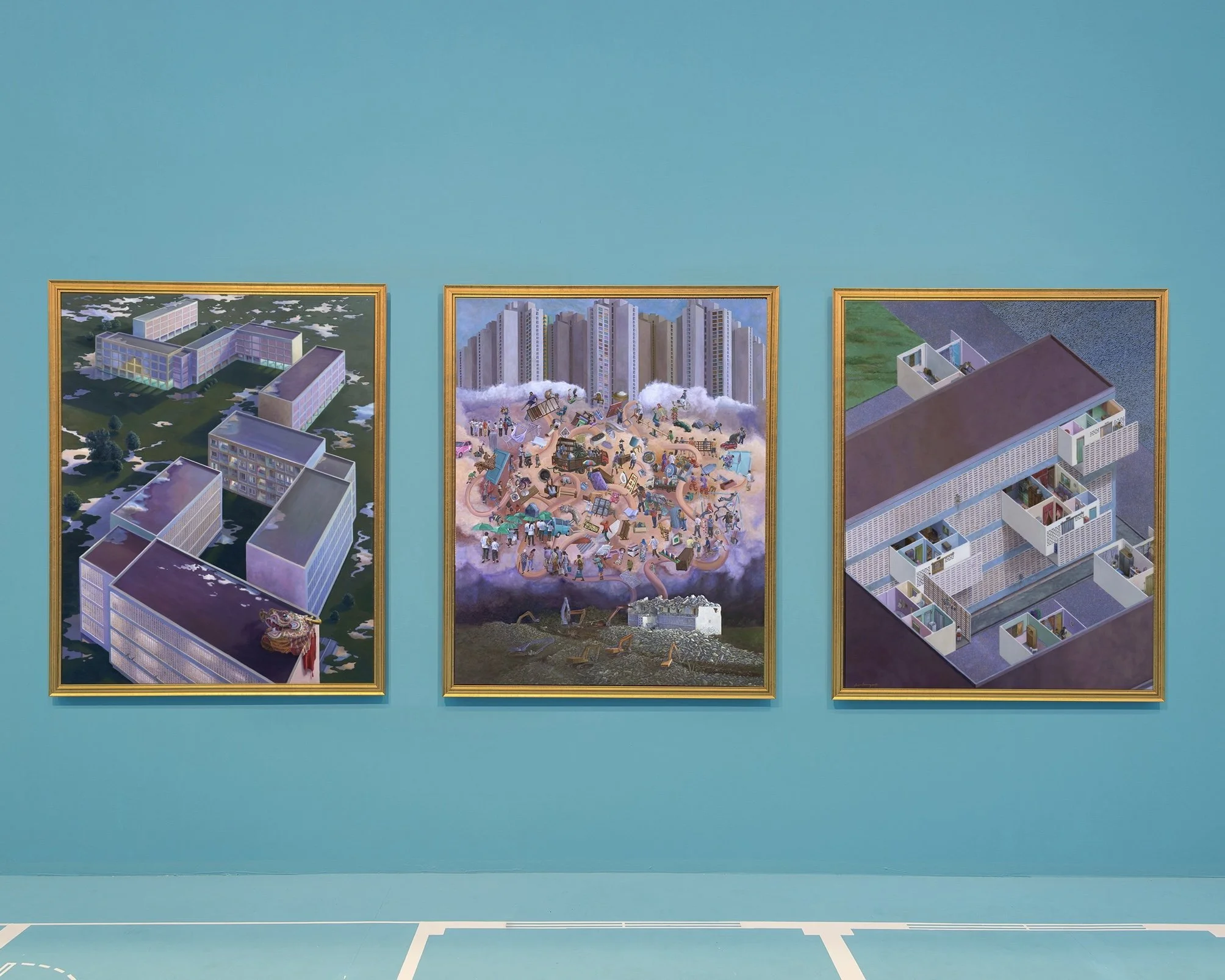 Leon Leong, Cracks in the Wall Triptych, 2017-18, oil on canvas, 150 x 120cm each. From left to right: A Farewell to Dragon, The Departure, Drawers of Memory. Image courtesy of the artist.