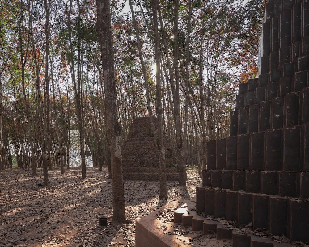 The curator Angkrit Ajchariyasophon and I decided to situate a new installation at Cherntawan Meditation Center as it corresponded to the subject of my work about contemplative space. After I saw the images of the abandoned rubber plantation, I immediately selected the location. I wanted to create a space for people to have time with themselves, to slow down and be able to notice the changes of surrounding nature. The work is not only about the three sculptural installations. It is about the experience of the entire garden, which is open for people to explore and be with themselves and meditate. Most of the work was done onsite and used local materials to blend in seamlessly with the site.