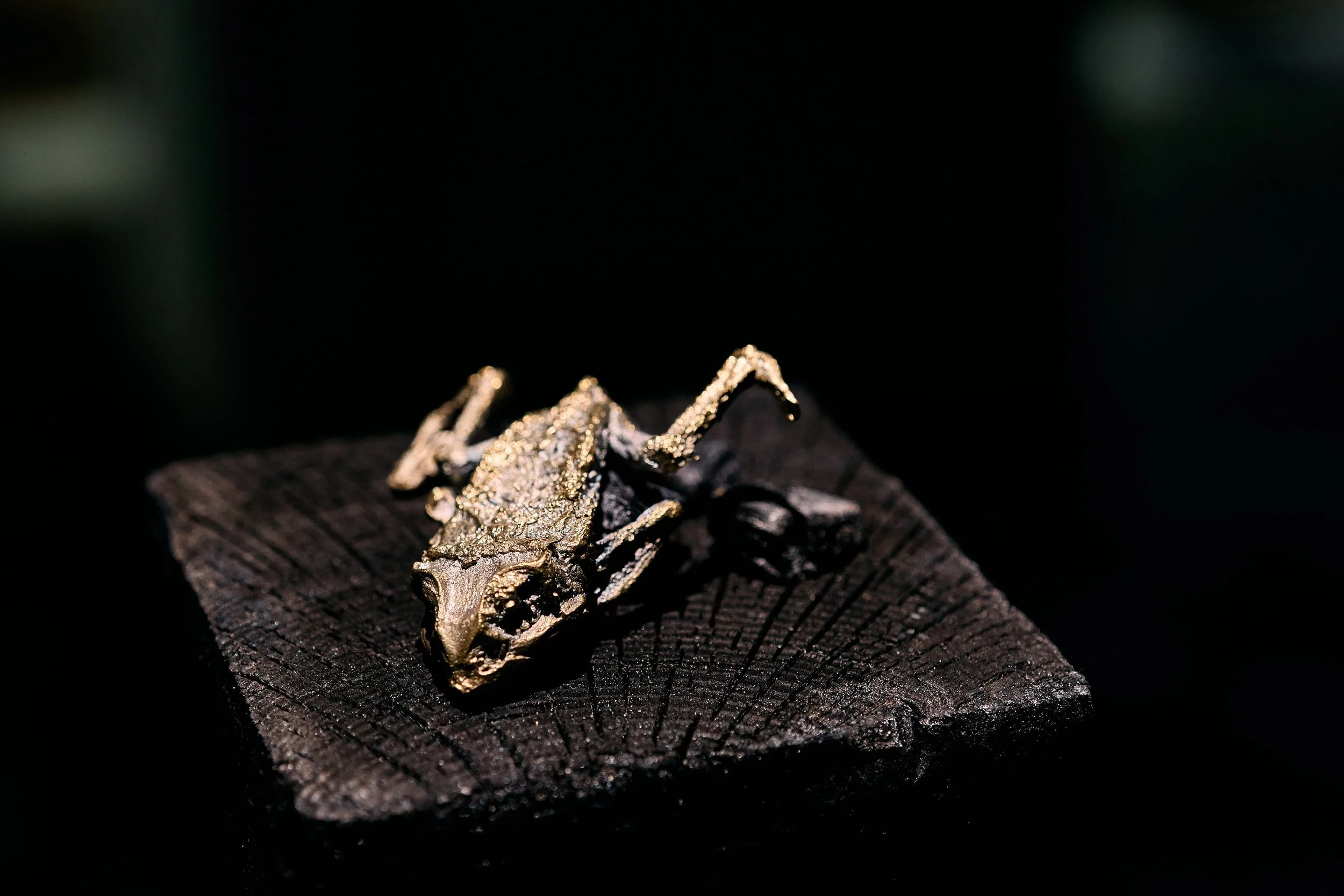 Sanitas Pradittasnee, A Frog in the Mud, 2024, Ban Pa-Ao brass casting, charcoal, charcoal pedestal, Thai traditional mirror, 600 x 740