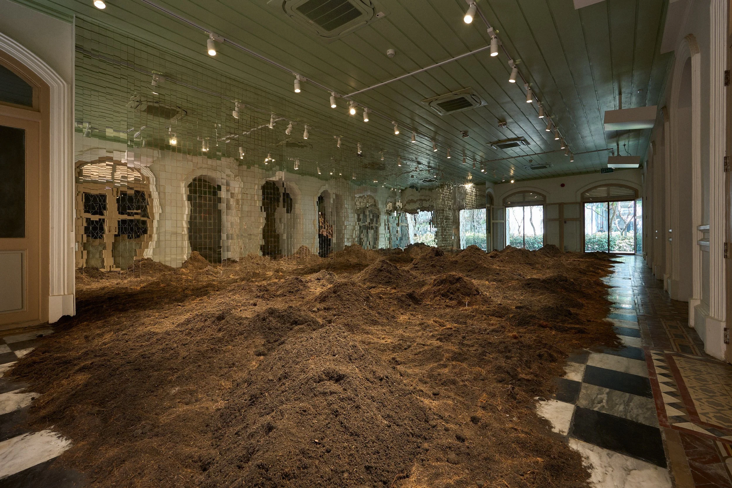Sanitas Pradittasnee, Primitive, 2024, soil and Thai traditional mirror, 515 x 1,850 x 330cm. Exhibition view in Landscape of Emptiness at Art Centre, Silpakorn University, Bangkok. Image courtesy of the artist.