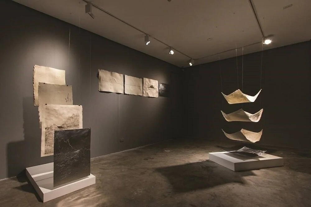Philippine artist Celine Lee’s practice involves using science and mathematics as a gateway to exploring contemporaneity. For A Surface, the artist explores the materiality of aluminum, the most plentiful metallic element on earth, and creates the topographical image of the Philippines on it. The aluminum etching is used to create the same image on Abaca paper, which is then transferred onto rice paper, and finally onto a surface that is a melding of Abaca and rice papers. The transfers imply exchange, coexistence and network, and asks us to look beyond the surface via these connections.