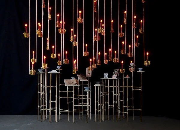 FX Harsono, Gazing on collective memory, 2016, wood, found objects, books, ceramic bowls, wooden butter mould, wooden cookie mould, metal spoons, 3D digital prints, framed photographs and electric candle lights. Image courtesy of National Gallery of Australia.