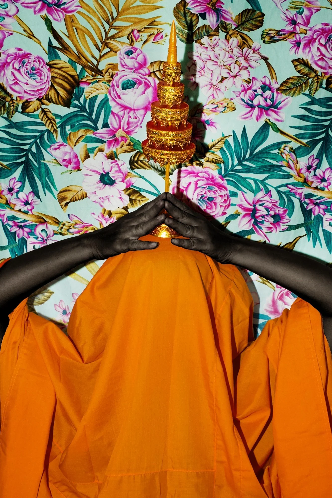 Equipped with his camera and a sense of humour, Thai artist Akkara Naktamna explores the supernatural, spirituality, and religion, which anchor Thai culture. In recent years, scandals such as the Thai temple fund fraud in 2017 caused their importance to dwindle slightly. It also caused many to look differently at the saffron robe worn by Theravada Buddhist monks. Once a symbol of spiritual liberation and a representation of Buddhism, the saffron robe is now perceived as an ordinary garment anybody, even non-believers, can wear. Akkara uses objects like dolls to symbolise innocence. They accompany black figures draped with bright orange robes, which illustrate his thoughts on how the greed and selfishness of man has tainted the purity of the religion.