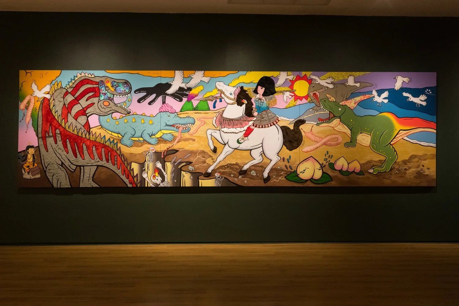 Yuree Kensaku, The Lady on a White Horse, 2019, acrylic, glitter, silver leaf and collage on linen, 150 x 540 cm. Image courtesy of Tang Contemporary Art, Bangkok.