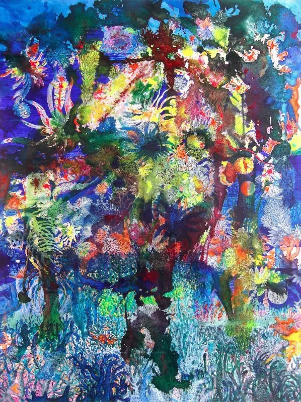 Entang Wiharso, Evolution: Floating Garden Series #1, 2016, acrylic, glitter and India ink on canvas, 285 x 200 cm. Image courtesy of ASEAN Gallery.