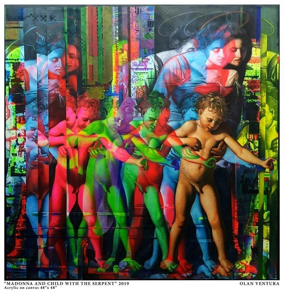 Olan Ventura, Madonna and Child with the Serpent, 2019, acrylic on canvas, 121.9 x 121.9cm. Image courtesy of West Gallery.