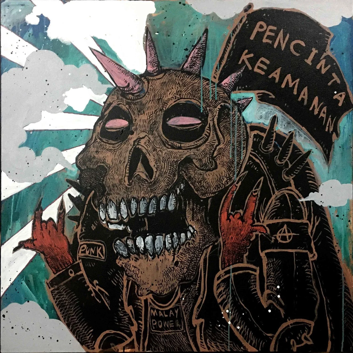 Syukur Rani, Kami Pencinta Keamanan, 2019, oil & acrylic on canvas, 90 x 90cm. Photograph by the artist. Image courtesy of Artemis Art.
