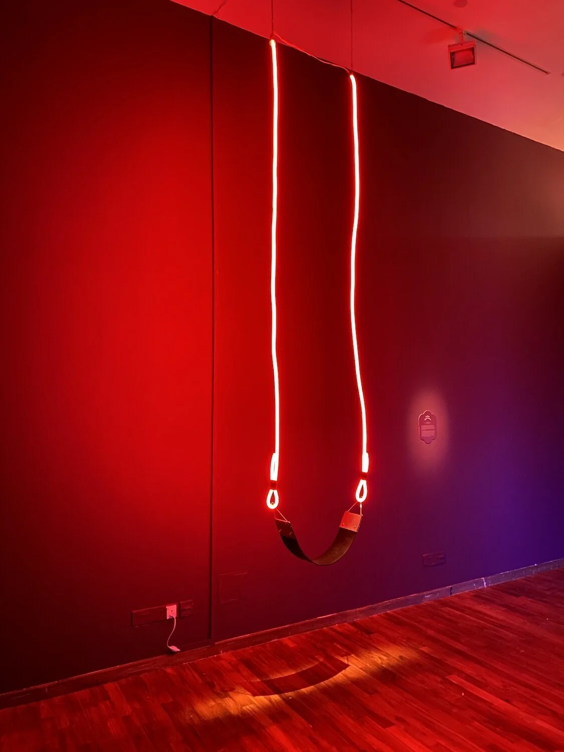 Joshua Kane Gomes, Untitled (Swing), 2017, steel, rubber and LED lights, 270 x 45cm. Image courtesy of NTU ADM Gallery.