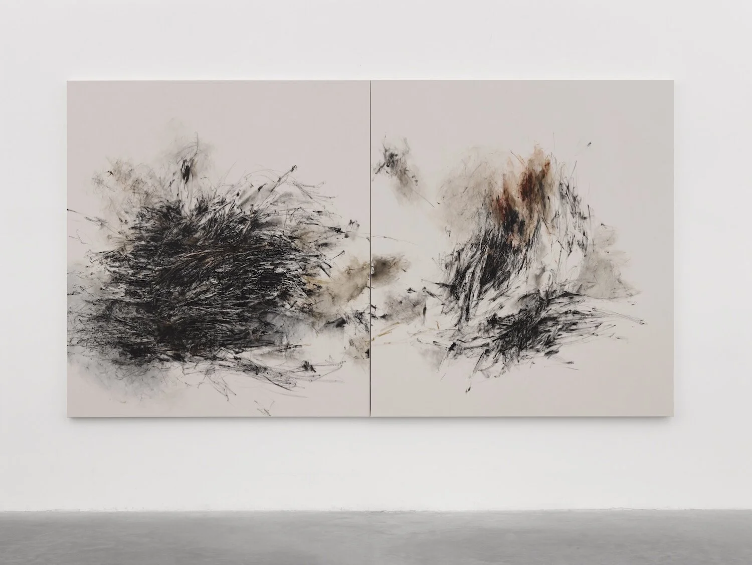 Christine Ay Tjoe, Pleasant Breath of The Black, 2018, oil on canvas, diptych, each: 200 x 180cm, overall: 200 x 360cm. Photograph by Theo Christelis, image courtesy of White Cube and the artist.