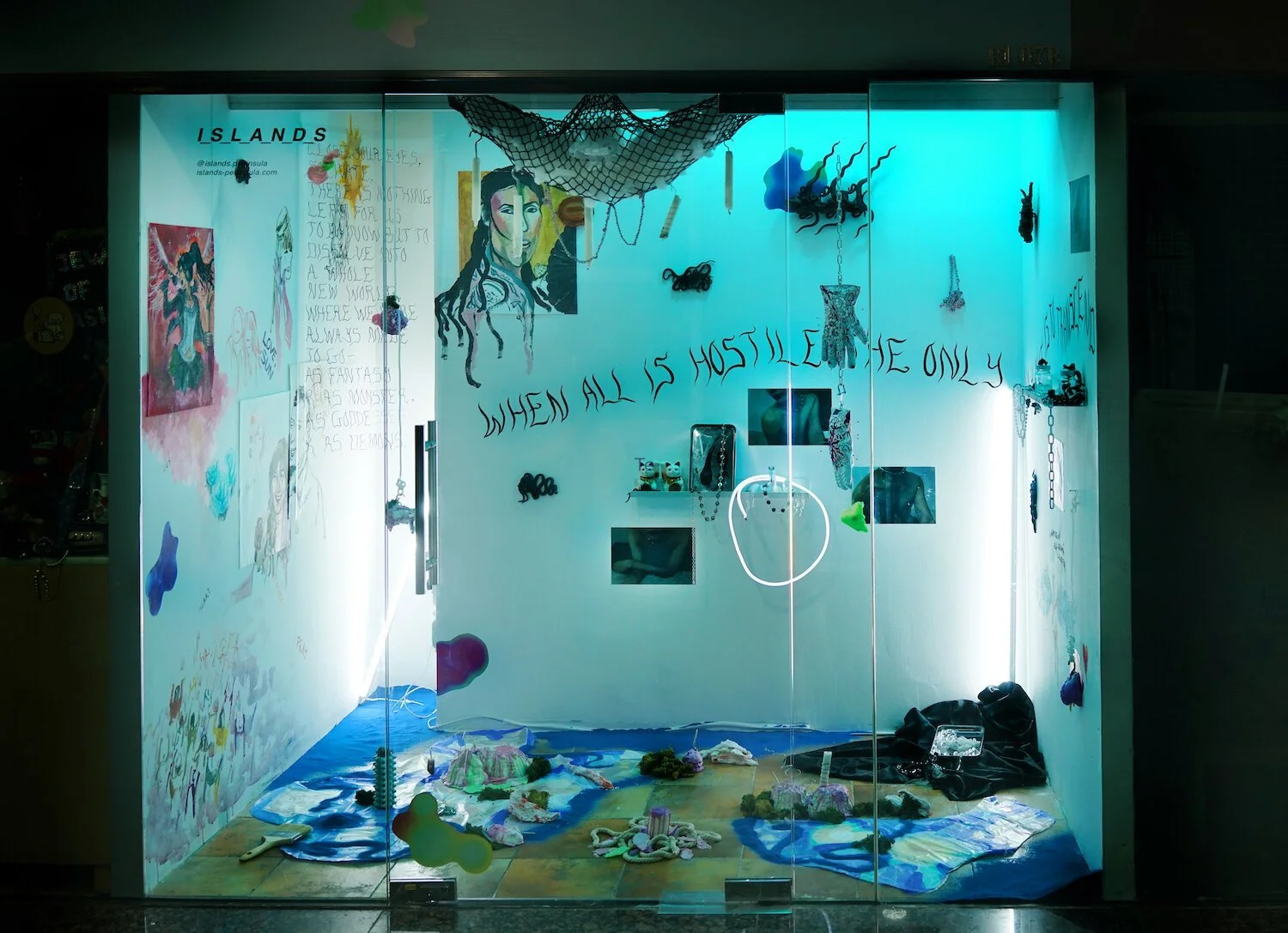 In collaboration with PURE EVER, an artist collective supporting underrepresented and emerging artists, I_S_L_A_N_D_S presents PrayPal as the first in a series of exhibitions to be held in their new gallery space. Challenging notions of humanity, the show frames the occult as a medium for understanding the threshold between the physical and spiritual. With various texts and paraphernalia made inaccessible by locked glass doors, the viewer is invited to question the normalcy of contemporary social experiences.