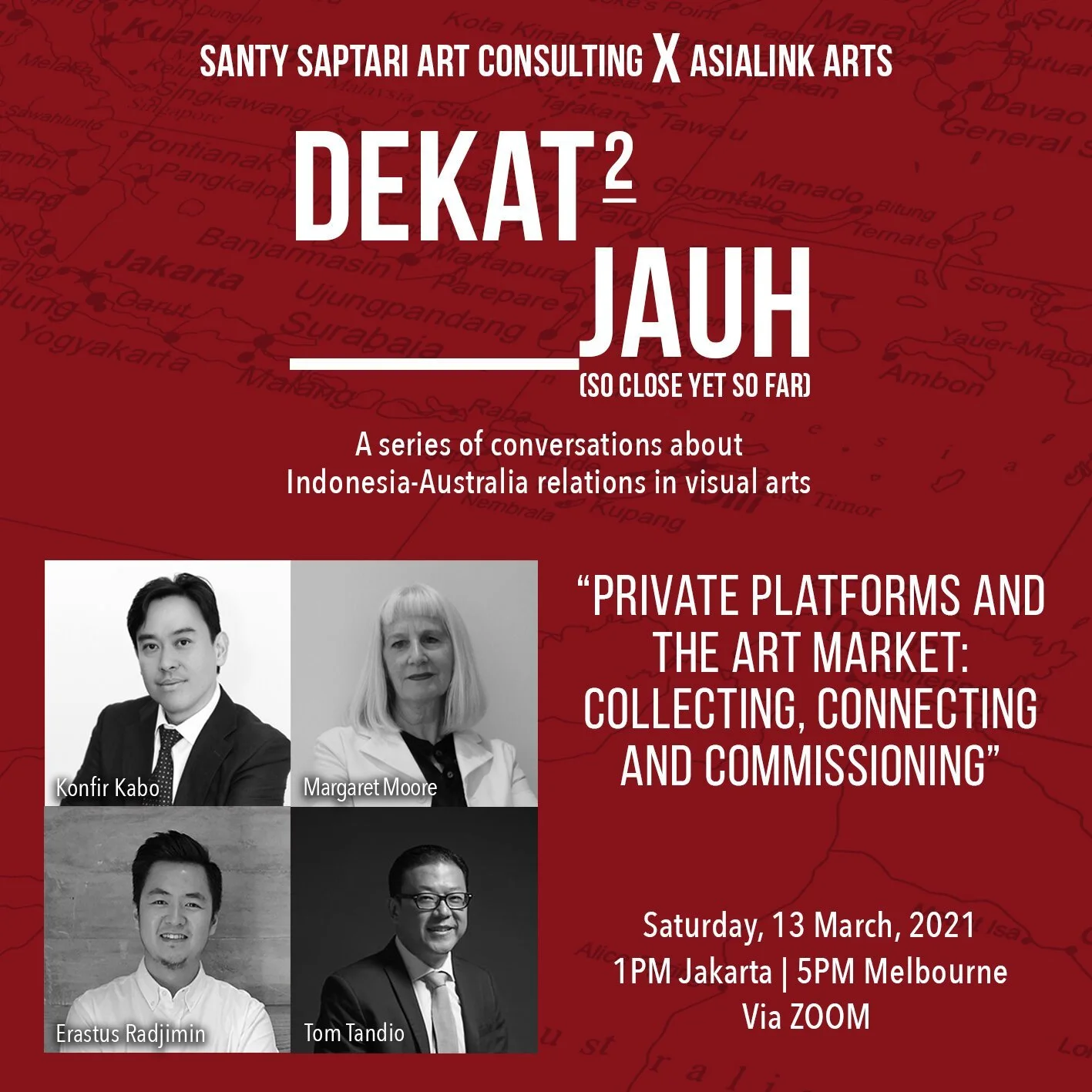Co-organised by Santy Saptari Art Consulting and Asialink Arts, DEKAT-DEKAT JAUH (So Close Yet So Far) is a talk series dissecting how the regional visual arts industry has become a means of cultural exchange between Indonesia and Australia. In its third iteration Konfir Kabo, Margaret Moore, Erastus Radjimin and Tom Tandio will take part in the panel discussion, Private Platforms and The Art Market: Collecting, Connecting, and Commissioning. This conversation will look at the collaborative role private collectors and organisations play in maintaining and fostering commercial relationships between the two countries.