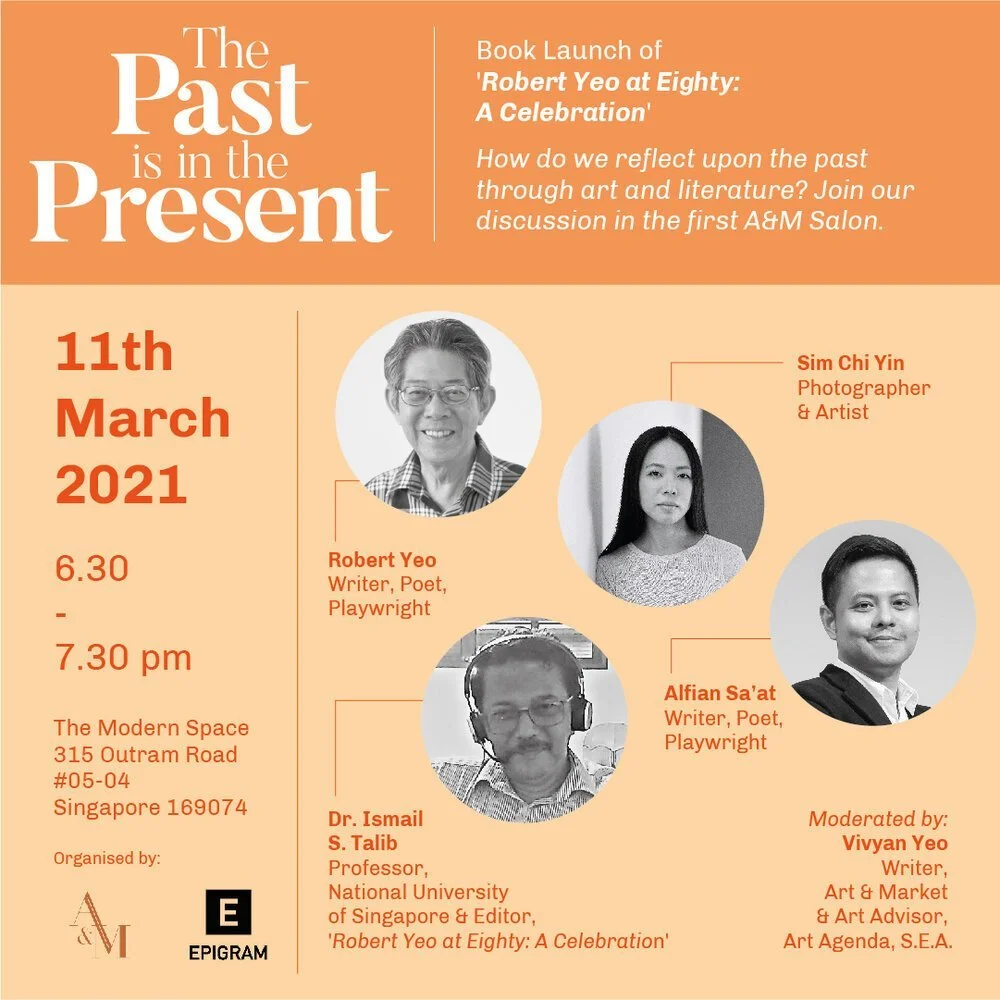 A&M Salon is our newest initiative that brings together creatives to discuss art at its intersections with other disciplines. Held in partnership with Epigram Books, the first A&M Salon is held in conjunction with the book launch of Robert Yeo at Eighty: A Celebration. Titled The Past is in the Present, speakers Robert Yeo, Alfian Sa'at, Sim Chi Yin, and Dr. Ismail S. Talib will start a cross-disciplinary dialogue on the use of art and literature as a medium to interrogate the past. Following the in-person event at The Modern Space in Singapore, the session will be broadcasted on YouTube the week after.