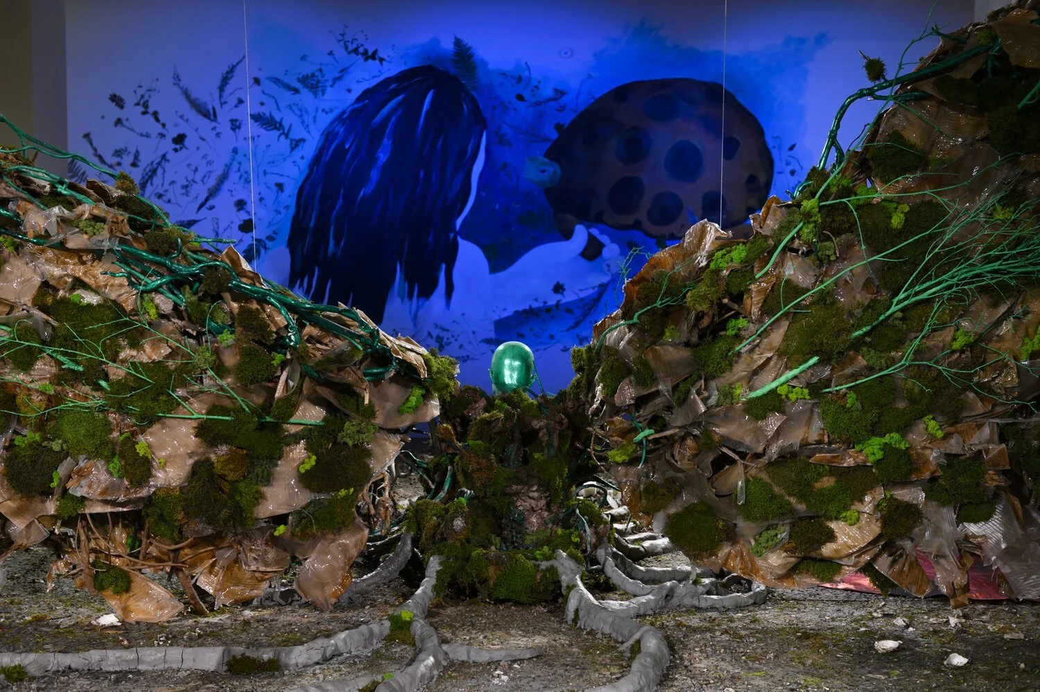 Korakrit Arunanondchai, Workshop for Peace, from a place/ not so familiar/ but relatable/ through the sound/ of its breath, 2018 (reworked 2021), 23 clay models of UN Secretariat building, cast of boychild’s head and of artist’s grandfather’s hands, fabric, blue clay, clay, wood, metal armature, banana leafs, soil, resin, moss. Photograph by Daniel Vincent Hansen.