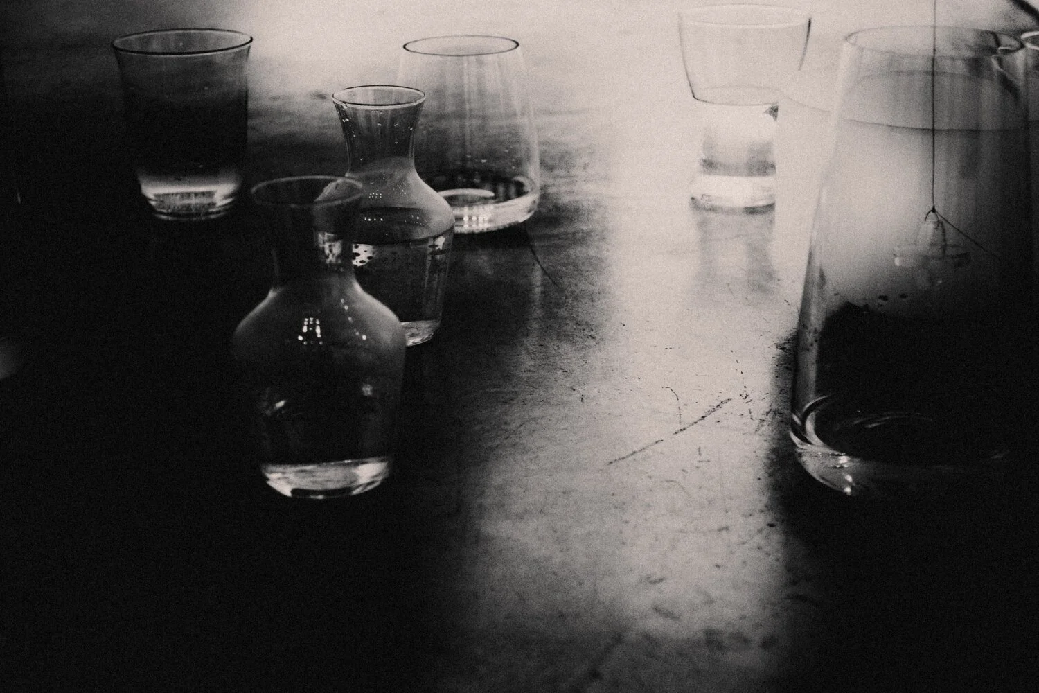 Suzann Victor, Strike (representation), 2021, Water/rainwater, glass vessels, strikers, stainless steel wires, dimensions variable. Photo courtesy of the Artist and STPI.