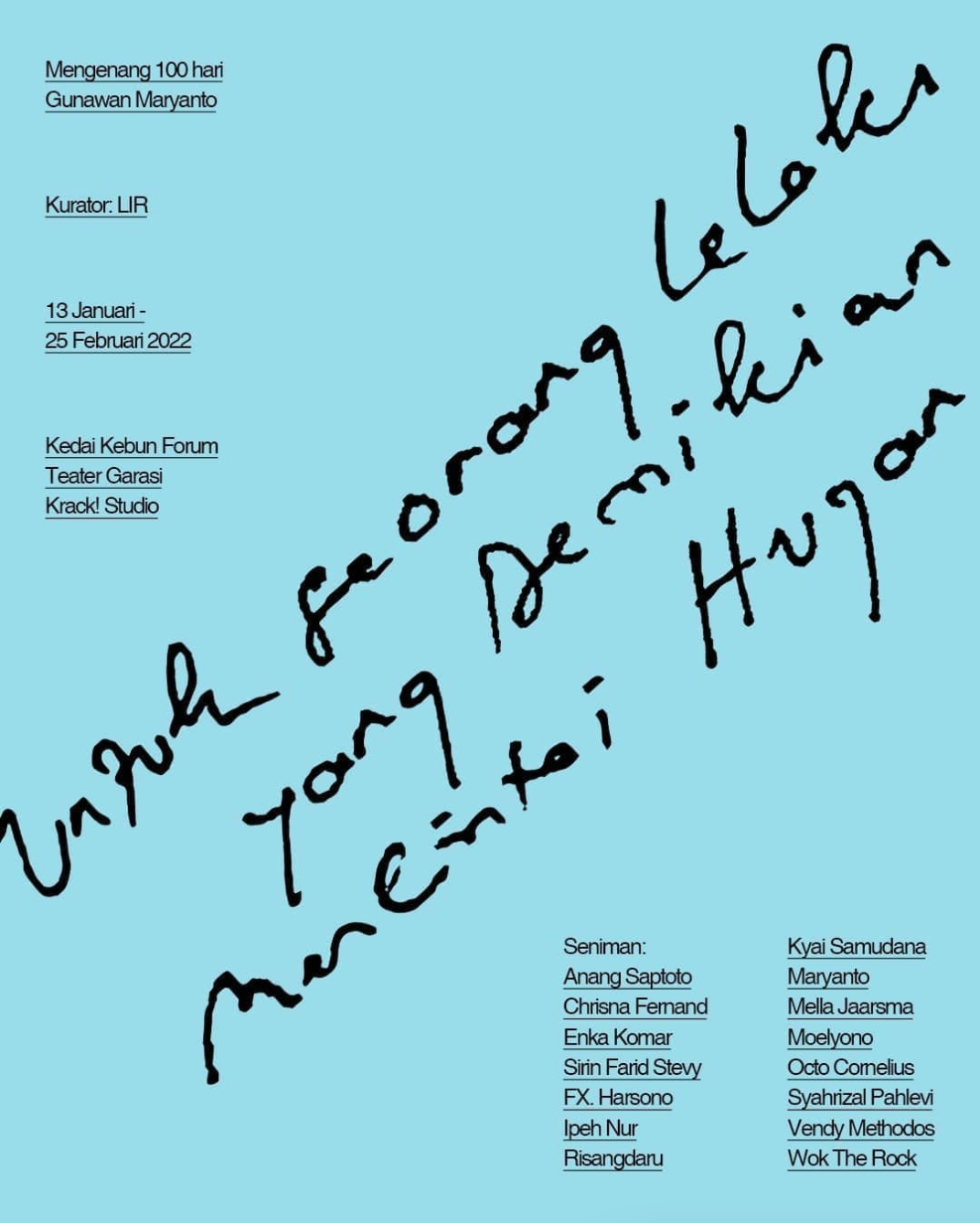 Curated by LIR, a curator collective duo consisting of Mira Asriningtyas and Dito Yuwono, the art exhibition titled Untuk Seorang Lelaki yang Demikan Mencintai Hujan is part of a mini festival with the same title to commemorate the 100th anniversary of the death of Gunawan Maryanto. This exhibition opened on the hundredth day of Gunawan Maryanto's departure by displaying the works of artists who had worked with him and were inspired by his works. The exhibiting artists are Anang Saptoto, Chrisna Fernand, Enka Komar, Sirin Farid Stevy, FX. Harsono, Ipeh Nur, Kyai Samudana, Maryanto, Mella Jaarsma, Moelyono, Octo Cornelius, Risangdaru, Syahrizal, Pahlevi, Vendy Methodos and Wok the Rock.