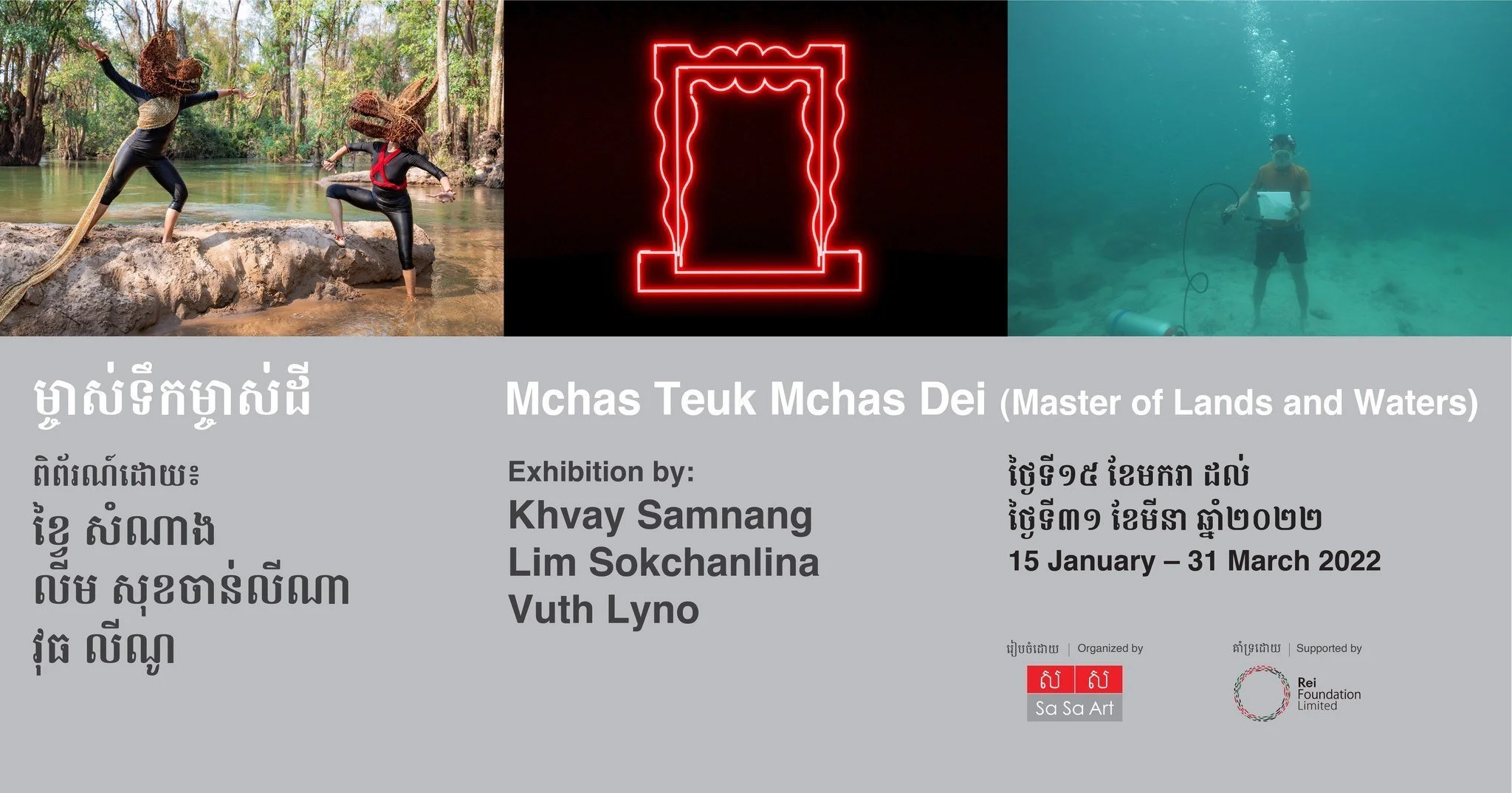 Mchas Teuk Mchas Dei (Master of Lands and Waters) is a group exhibition by Cambodian arts collective Stiev Selapak: Khvay Samnang, Lim Sokchanlina, and Vuth Lyno, who present their artworks together for the first time at Sa Sa Art Projects. The exhibition introduces their recent works in the form of videos, sculptures, photographs, and light installation, focusing on beliefs in nature and practices in the supernatural, animism, and the powerful spirits that take care of our homes, lands, people, animals, and living beings.
