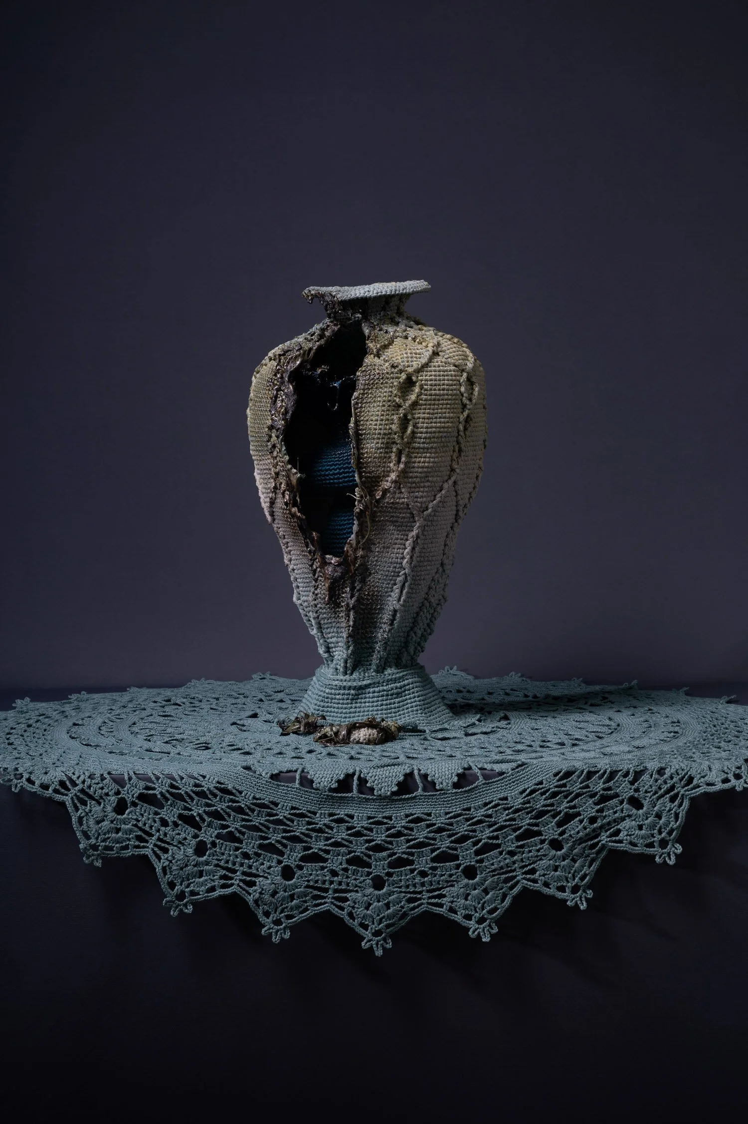 In Kelly Limerick's first solo exhibition, Unbecoming, the artist takes her crocheting practice to new heights by presenting a body of work which focuses on the process of making through destruction. Employing the skills of Singaporean photographer Clarence Aw and the Berlin-based film director, Joy Song, Limerick's exhibition documents the torching of her meticulously crafted crochet vases. With only photographs to preserve the memory of the state of the vases before they are marred, the audience is left to reflect on the correlations between art, craft, and the value of labour in our contemporary world.