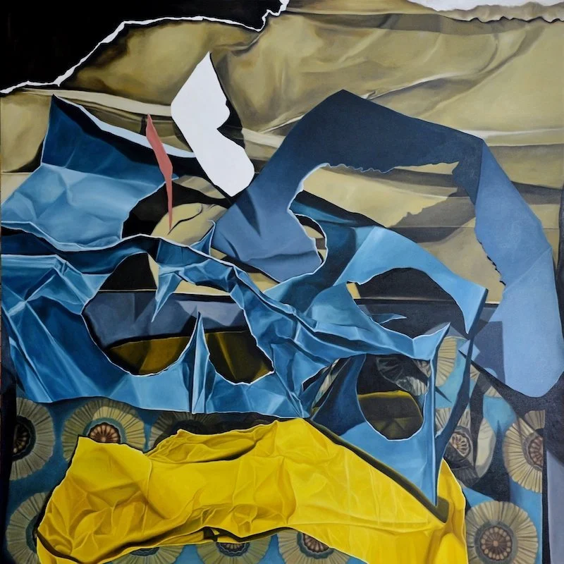 Ayka Go’s Of Shadows and Collected Time is her first solo exhibition in Singapore. She illustrates the temporary nature of time and beauty in imperfections through paper, following the Japanese values of ‘mono no aware’ and ‘Wabi-Sabi’. The shapes in her paintings are drawn from the torn and crumpled paper she keeps in her studio. She often changes its composition until it suits the moment she is going through. From there, she draws the composition onto her canvas. Through the masterful use of strong colours, shadows and trompe l’oeil composition as seen in collage study 16.9 (2022), the viewers can immerse themselves in the dynamic form of paper –- a mundane daily life object.