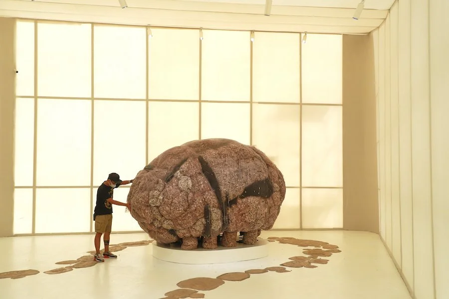 Christine Ay Tjoe, Personal Denominator, 2022, kinetic installation constructed from air pump, plastic balloon, steel, fiberglass, synthetic fabrics, palm fiber, Dacron, cotton threads, and goose feathers, variable dimensions. Image courtesy of the artist and ARTJOG MMXXII.